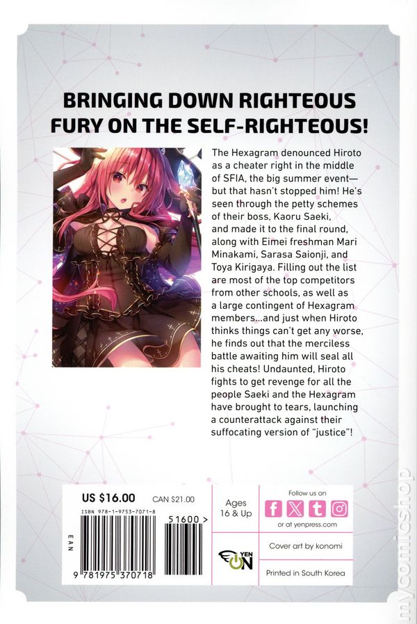 Volume 7 - 1str printing. Written by Haruki Kuou. Art and cover by Konomi. Translated by Kevin Gifford. The Hexagram denounced Hiroto as a cheater right in the middle of SFIA, the big summer event—but that hasnt stopped him! Hes seen through the petty schemes of their boss, Kaoru Saeki, to make it to the final, along with Eimei freshman Mari Minakami, Sarasa Saionji, and Toya Kirigaya. Filling out the list are most of the top competitors from other schools, as well as a large contingent of other Hexagram members…and just when Hiroto thinks things cant get worse, he finds out that the merciless battle awaiting him will seal all his cheats! Undaunted, Hiroto fights to get revenge for all the people Saeki and the Hexagram brought to tears, launching a counterattack against their suffocating version of justice! Softcover, 5-in. x 7-in., 248 pages, Text (with B&W Chapter Illustrations). Ages 16&Up Cover price $16.00.
