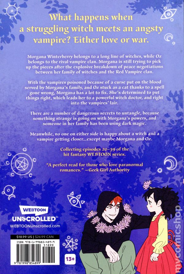 Volume 2 - 1st printing. Story and art by Miyuli. 2025 RINGO AWARD NOMINATION for Best Digital Book of the Year! This stunning series by debut author Miyuli, perfect for fans of both fantasy and romance, explores what happens when a struggling witch meets an angsty vampire—either love or war. This stunning series by debut author Miyuli, perfect for fans of both fantasy and romance, explores what happens when a struggling witch meets an angsty vampire—either love or war. Morgana Winterberry belongs to a long line of witches, while Oz belongs to the rival vampire clan. After a chance encounter…and maybe a few stray spells…these two need to find a way to work together, or risk all-out war between coven and clan. Morgana is still trying to pick up the pieces after the explosive breakdown of peace negotiations between her family of witches and the Red Vampire clan. With the vampires poisoned because of a curse put on the blood served by Morganas family, and Oz stuck as a cat thanks to a spell gone wrong, Morgana has a lot to fix. Shes determined to put things right, which leads her to a powerful witch doctor, and right into the vampires lair. There are a number of dangerous secrets to untangle, because something strange is going on with Morganas powers, and someone in her family has been using dark magic. Meanwhile, no one on either side is happy about a witch and a vampire getting closer…except maybe Morgana and Oz. This volume collects episodes 20 – 39 of the hit fantasy WEBTOON series. Softcover, 6-in. x 9-in., 320 pages, full color. Rated: 13+ Cover price $18.99.