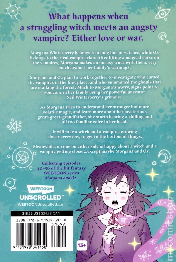 Volume 3 - 1st printing. Story and art by Miyuli. 2025 RINGO AWARD NOMINATION for Best Digital Book of the Year! In this stunning debut series by Miyuli, perfect for fans of fantasy and romance, a struggling witch crosses paths with an angsty vampire, setting the stage for either love or war. Morgana Winterberry belongs to a long line of witches, while Oz belongs to the rival vampire clan. After lifting a magical curse on the vampires, Morgana makes an uneasy truce with them, very much against her family's warnings. Morgana and Oz plan to work together to investigate who cursed the vampires in the first place, and who summoned the ghouls that are stalking the forest. Much to Morganas worry, signs point to someone in her family using her powerful ancestor Neil Winterberry's grimoire. As Morgana tries to understand her stronger but more volatile magic, and learn more about her mysterious great-great-grandfather, she starts hearing a chilling and all too familiar voice in her head. It will take a witch and a vampire, growing closer every day, to get to the bottom of things. This volume collects episodes 40 to 58 of the hit fantasy WEBTOON series with over 76 million reads, Morgana and Oz. Softcover, 6-in. x 9-in., 288 pages, full color. Rated: 13+ Cover price $18.99.