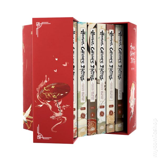 Box Set - Volume 1-6 - Printings May Vary. Includes 1 acrylic standee with holographic background, 2 large badges, 1 sticker pack, 2 mini-posters, 2 postcards, and 1 filmstrip bookmark. Based on the Story by Mo Xiang Tong Xiu. Translated by Charlie Robinson and Ann Gree. Aloha Comics proudly presents the collector's box set edition of the Heaven Official's Blessing manhua adapted from the super popular anime based on the best-selling novel of the same name by Mo Xiang Tong Xiu. The stunningly beautiful animation that won the hearts of millions has been captured on paper and is now available in English in a premium hardcover edition. The main characters will steal your heart from the first pages of volume one, and their adventures will have you gasping until the last page of volume six! Hardcover, 1,520 pages, full color. Mature Readers Cover price $160.00.