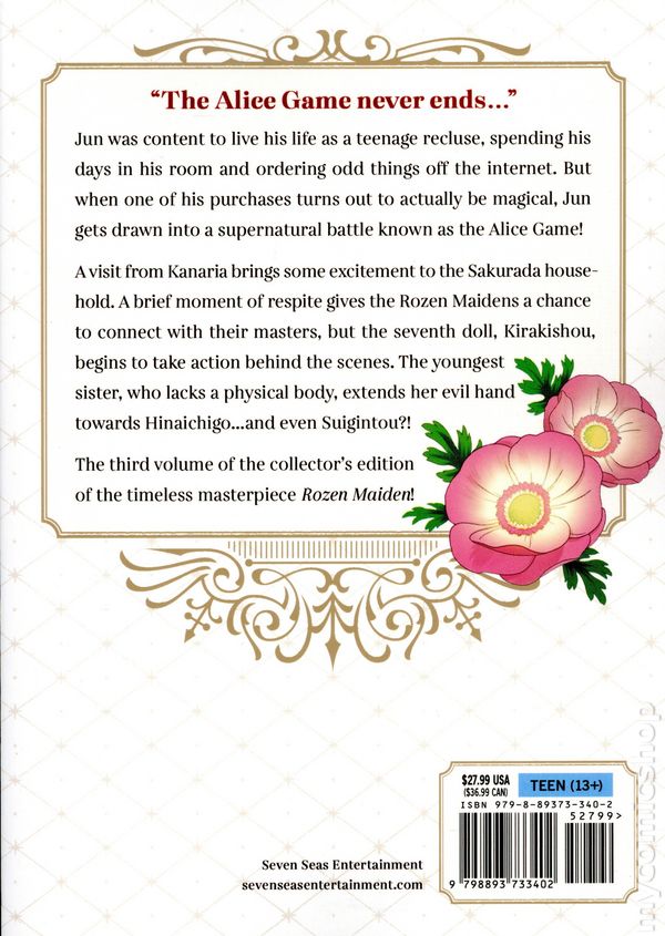 Volume 3 - 1st printing. Story and art by Peach-Pit. Translated by Minna Lin. THE ALICE GAME NEVER ENDS... Jun was content to live his life as a teenage recluse, spending his days in his room and ordering odd things off the internet. But when one of his purchases turns out to actually be magical, Jun gets drawn into a supernatural battle known as the Alice Game! A visit from Kanaria brings some excitement to the Sakurada household. A brief moment of respite gives the Rozen Maidens a chance to connect with their masters, but the seventh doll, Kirakishou, begins to take action behind the scenes. The youngest sister, who lacks a physical body, extends her evil hand towards Hinaichigo...and even Suigintou?! The third volume of the collector's edition of the timeless masterpiece Rozen Maiden! Softcover, 6-in. x 8 1/2-in., 462 pages, B&W. Teen (13+) Cover price $27.99.