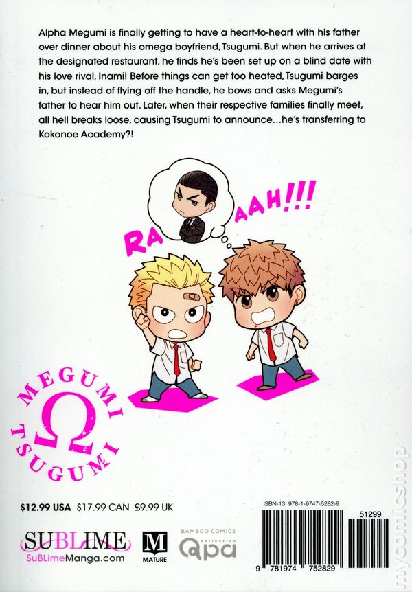 Volume 5 - 1st printing. Story and art by Mitsuru Si. Translated by Adrienne Beck. A tough-guy omega who believes he can control his heats through sheer willpower meets his match when he faces off with an alpha unlike any he's ever encountered before! Tsugumi is an omega whose sole goal in life is to beat up any alpha who crosses his path. But when he faces off with Megumi, he's finally met his match-just not in the way he thinks! Alpha Megumi is finally getting to have a heart-to-heart with his father over dinner about his omega boyfriend, Tsugumi. But when he arrives at the designated restaurant, he finds he's been set up on a blind date with his love rival, Inami! Before things can get too heated, Tsugumi barges in, but instead of flying off the handle, he bows and asks Megumi's father to hear him out. Later, when their respective families finally meet, all hell breaks loose, causing Tsugumi to announce...he's transferring to Kokonoe Academy?! Softcover, 5-in. x 7-in., 218 pages, B&W. Mature Readers Cover price $12.99.