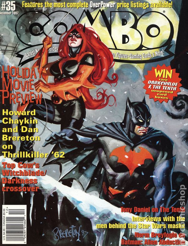Polybagged with extras. December 1997. Latest news & prices for comics, non-sport cards, action figures, gaming cards & more. In this issue: Holiday Movie Preview; Howard Chaykin and Dan Brereton on Thrillkiller '62; Top Cow's Witchblade/Darkness crossover; Tony Daniel on The Tenth; interviews with the men behind the Star Wars masks; Norm Breyfogle on Batman: The Abduction. Thrillkiller '62 cover (featuring Batman and Batgirl) by Dan Brereton. Cover price $4.99. Cover price $4.99.