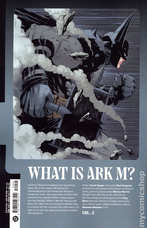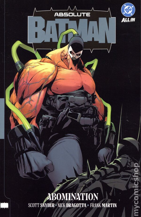 Volume 2 - 2nd and later printings. "Abomination!" Collects Absolute Batman (2024 DC) #7-14. Written by Scott Snyder. Art by Nick Dragotta, Marcos Martin, and Clay Mann. Cover by Nick Dragotta. DON'T MISS THE SECOND VOLUME OF SCOTT SNYDER AND NICK DRAGOTTA'S GROUNDBREAKING BATMAN EPIC! As Bruce Wayne investigates the mysterious black site known as Ark M, he reluctantly draws his friends into Batman's dangerous work--and comes face-to-face with powerful new enemies. What is happening at this dark facility? What is Alfred's history with Bane, the villain who has arrived in Gotham City to protect Ark M's secrets? And what does it all have to do with the mysterious Joker? Softcover, 240 pages, full color. Teen+ Cover price $19.99.
