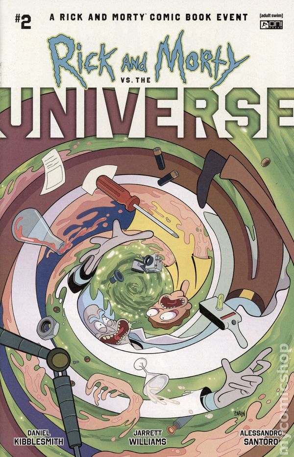 Written by Daniel Kibblesmith. Art by Jarrett Williams. Cover by Dave Bardin. THE COMIC BOOK EVENT 13.7 BILLION YEARS IN THE MAKING IS JUST GETTING STARTED! Chaotically cosmic creators Daniel Kibblesmith (Loki) and Jarrett Williams (Speed Force) are about to turn everything you know about RICK AND MORTY upside down . . . along with several billion nebulae). Wow, well. Rick and Morty have certainly %&$@ ed things up.  The wedding is clearly off and the Parmesan Universe is out for blood. The Smith family find themselves on the run and they cant even use portal tech to escape! The only person Rick and Morty can turn to now is Mr. Poopy Butthole, who is still harboring some hard feelings toward Rick. Sheesh, is there anyone Rick HASNT pissed off?  Nevertheless, Rick will need his help in order to carry out his plan to REBOOT THE UNIVERSE. Did you think we were joking about this being an EVENT?!? 28 pages, full color. Rated M Cover price $4.99.