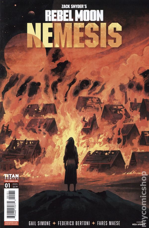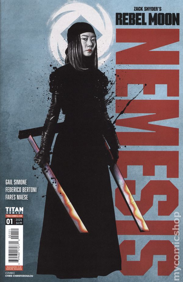 (W) Zack Snyder, Gail Simone (A) Federico Bertoni (CA) Frank Mazzoli COMIC BOOK PREQUEL TO THE NETFLIX MOVIE, REBEL MOON! BASED ON A STORY BY ZACK SNYDER AND WRITTEN BY AWARD WINNING COMIC CREATOR GAIL SIMONE. A brand new comic series that recounts the origins of NEMESIS! Taking place before she became the sword-wielding, cyborg assassin, this is an action-packed and badass story in the style of a revenge western, in which an innocent woman finds herself in the path of Imperium soldiers who slaughter her family... Cover price $4.99.
