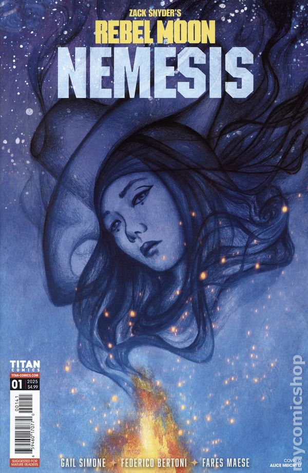 Written by Zack Snyder, Gail Simone. Art by Federico Bertoni. Cover by Cathy Kwan. COMIC BOOK PREQUEL TO THE NETFLIX MOVIE, REBEL MOON! BASED ON A STORY BY ZACK SNYDER AND WRITTEN BY AWARD WINNING COMIC CREATOR GAIL SIMONE. A brand new comic series that recounts the origins of NEMESIS! Taking place before she became the sword-wielding, cyborg assassin, this is an action-packed and badass story in the style of a revenge western, in which an innocent woman finds herself in the path of Imperium soldiers who slaughter her family... 28 pages, full color. Rated M Cover price $4.99.