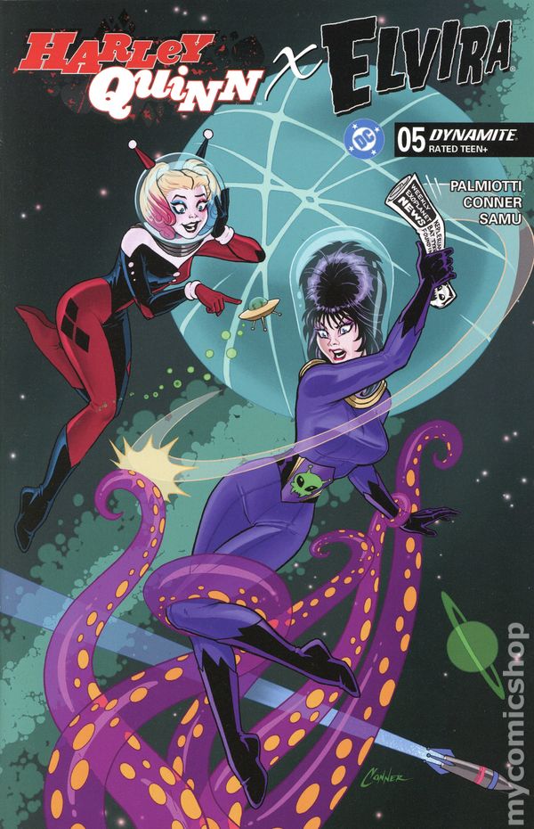 View scans(W) Amanda Conner, Jimmy Palmiotti (A) Amanda Conner, Juan Samu (CA) Amanda Conner THE MISTRESS OF THE DARK MEETS DADDY'S LITTLE MONSTER! What happens when the Clown Princess of Crime gets bored? Shenanigans, hijinks, grievous bodily harm… the possibilities are endless! Now add in a certain macabre-minded TV host who seems to attract trouble like crypts attract vampires, and the stage is set for the greatest team-up since Frankenstein met his Bride! With her beloved show on the chopping block following a corporate takeover, Elvira needs to come up with a plan to get things back in the black - and her new friend Harley Quinn has an idea that's just crazy enough to work! Together, they're going to throw the greatest Halloween party Brooklyn has ever seen - whether the borough likes it or not! Written by AMANDA CONNER and JIMMY PALMIOTTI - the world-famous tag-team of all things Harley Quinn - this crossover event for the ages from Dynamite and DC Comics also showcases Amanda's fan-favorite artistic chops, with each issue featuring two (count 'em, two) Conner covers. And that's not all (certainly not!) - she's also joining interior artist (and Elvira favorite) JUAN SAMU to provide selected story pages for the series! But wait, there's more! This premier issue also includes darkly captivating covers from JOSEPH MICHAEL LINSNER, CHAD HARDIN, BEN CALDWELL, and best-selling Mark Spears Monsters creator MARK SPEARS! 32 pages, full color, rated Teen+. Cover price $29.99.