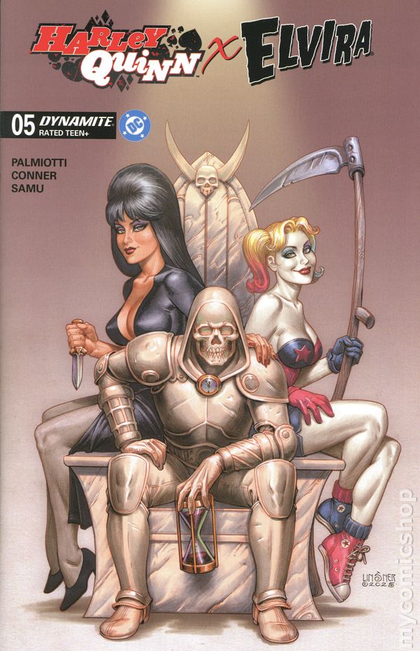 (W) Amanda Conner, Jimmy Palmiotti (A) Amanda Conner, Juan Samu (CA) Joseph Michael Linsner THE MISTRESS OF THE DARK MEETS DADDY'S LITTLE MONSTER! What happens when the Clown Princess of Crime gets bored? Shenanigans, hijinks, grievous bodily harm… the possibilities are endless! Now add in a certain macabre-minded TV host who seems to attract trouble like crypts attract vampires, and the stage is set for the greatest team-up since Frankenstein met his Bride! With her beloved show on the chopping block following a corporate takeover, Elvira needs to come up with a plan to get things back in the black - and her new friend Harley Quinn has an idea that's just crazy enough to work! Together, they're going to throw the greatest Halloween party Brooklyn has ever seen - whether the borough likes it or not! Written by AMANDA CONNER and JIMMY PALMIOTTI - the world-famous tag-team of all things Harley Quinn - this crossover event for the ages from Dynamite and DC Comics also showcases Amanda's fan-favorite artistic chops, with each issue featuring two (count 'em, two) Conner covers. And that's not all (certainly not!) - she's also joining interior artist (and Elvira favorite) JUAN SAMU to provide selected story pages for the series! But wait, there's more! This premier issue also includes darkly captivating covers from JOSEPH MICHAEL LINSNER, CHAD HARDIN, BEN CALDWELL, and best-selling Mark Spears Monsters creator MARK SPEARS! 32 pages, full color, teen+. Cover price $4.99.