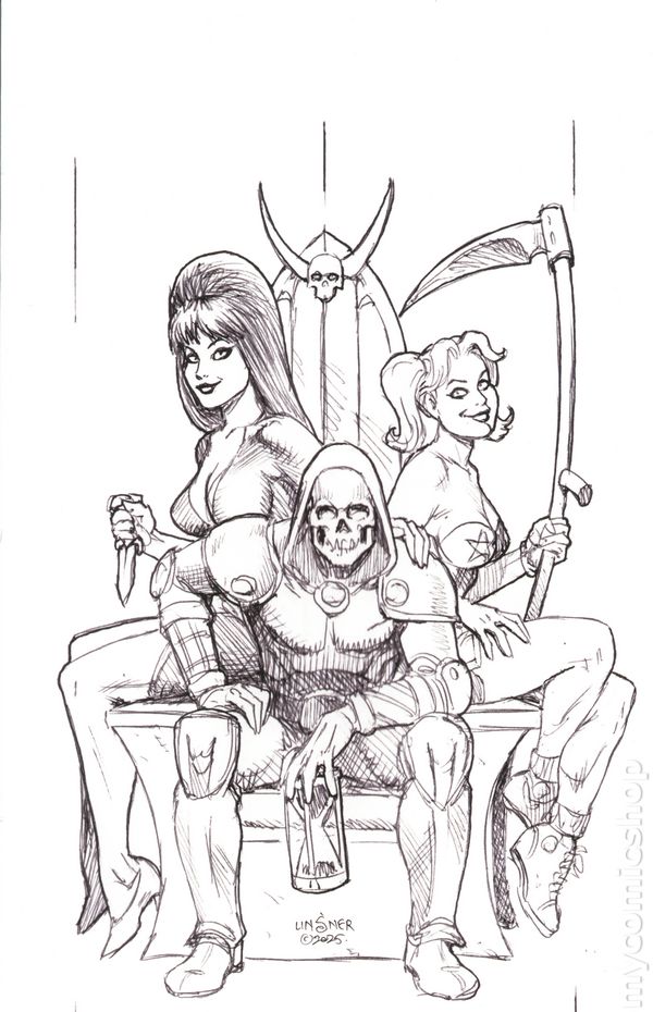 Limited 1 for 7 Retailer Incentive Variant Cover. (W) Amanda Conner, Jimmy Palmiotti (A) Juan Samu, Amanda Conner (CA) Joseph Michael Linsner FROM CLASSIC CASTLES TO COSMIC CHAOS! After making a daring escape from their would-be captors in Transylvania, Elvira and Harley Quinn find themselves rocketing through space with the ever-dashing Vartox. Their destination? A jaw-dropping interspecies wedding in a galaxy far, far away. But when the ceremony spirals into madness and Elvira is abducted by a fanatical alien cult that worships her with drooling devotion… well, thats when things start to get weird! Cover price $4.99.