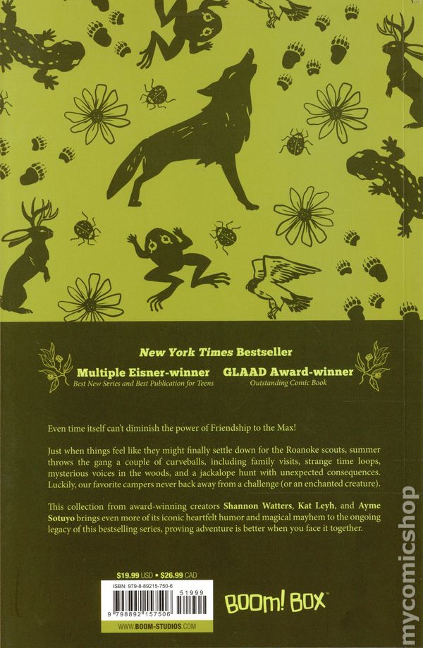 Volume 4 - 1st printing. Collects Lumberjanes (2014-2020) #37-48. Written by Shannon Watters and Kat Leyh. Art by Ayme Sotuyo. Cover by Gus Allen. Even time itself cant diminish the power of Friendship to the Max! Just when things feel like they might finally settle down for the Roanoke scouts, summer throws the gang a couple of curveballs, including family visits, strange time loops, mysterious voices in the woods, and a jackalope hunt with unexpected consequences. Luckily, our favorite campers never back away from a challenge (or an enchanted creature). This collection from award-winning creators Shannon Watters, Kat Leyh, and Ayme Sotuyo brings even more of its iconic heartfelt humor and magical mayhem to the ongoing legacy of this bestselling series, proving adventure is better when you face it together. Softcover, 336 pages, full color. Cover price $19.99.