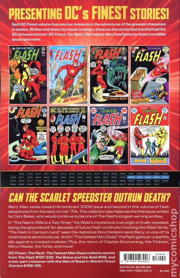 1st printing. Collects stories from The Flash (1959-1985 1st Series DC) #197-229, and stories from The Brave and the Bold (1955-1983 1st Series DC) #99 and World's Finest (1941) #198-199. Written by Mike Friedrich, Robert Kanigher, John Broome, Cary Bates, Gardner Fox, Len Wein, John Warner [as J. David Warner], Bob Haney, and Dennis O'Neil. Art by Gil Kane, Vince Colletta, Irv Novick, Murphy Anderson, Carmine Infantino, Joe Giella, Dick Giordano, Bernard Sachs, Frank McLaughlin, Tex Blaisdell, Bob Brown, Nick Cardy, Dick Dillin, and Joe Giella. Cover by Dick Giordano. CAN THE SCARLET SPEEDSTER OUTRUN DEATH? Barry Allen races toward his landmark 200th issue and beyond in this volume of Flash adventures from the early to mid-'70s. This collection also features the first issue written by Cary Bates, who would continue to be one of the Flash's longest-serving scribes. In this collection, Iris West's mysterious true origin is finally revealed, and Abra Kadabra sends Barry on one of his most bizarre adventures yet. Plus, the return of Captain Boomerang, the Trickster, Mirror Master, the Turtle, and more! Softcover, 672 pages, full color. Teen Cover price $39.99.