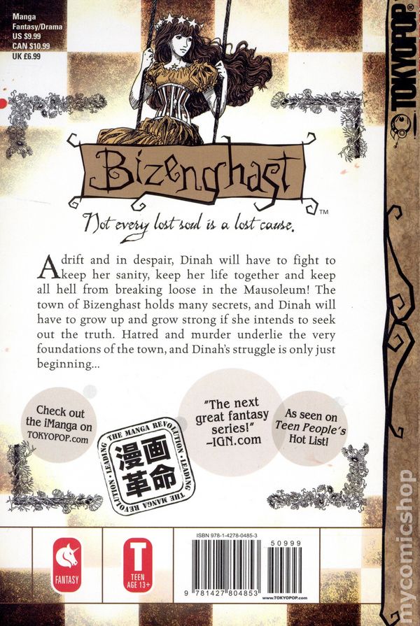 Volume 1 - 1st printing. Story and art by M. Alice LeGrow. Meet Dinah, a disturbed young girl who has been sent to the small town of Bizenghast to live with her aunt following the tragic death of her parents. Dinah thinks her aunt's house is haunted, but her aunt thinks she has some sort of mental illness. Dinah sneaks out with her only friend, Vincent, and together they discover a lost graveyard where Dinah reads from a stone engraving. This act binds her to a contract requiring Dinah to release spirits stuck somewhere between life and the afterlife. So Dinah begins her quest of "cleaning" the vaults, crypts and graves of lost souls, while struggling with the haunts at home and suspicions of her growing mental illness. Softcover, 5-in. x 7-in., 192 pages, B&W. Teen Cover price $9.99.