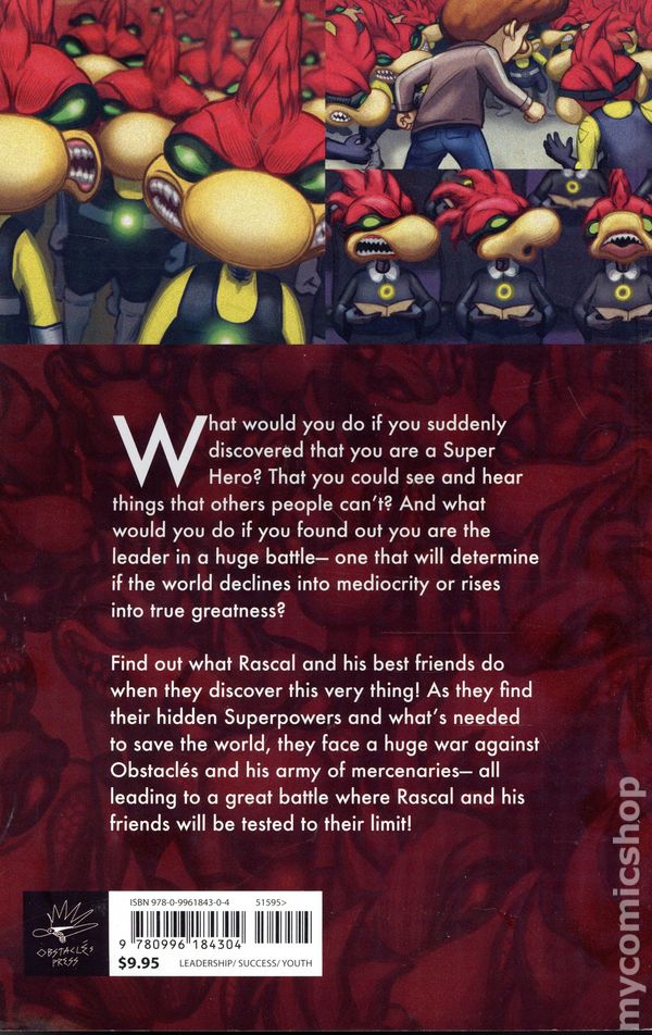 Volume 1 - 1st printing. Written by Oliver DeMille. Art and cover by Eric Hungerford. What would you do if you suddenly discovered you were a super hero? That you could see and hear things other people can't? And what would you do if you found out you are the leader in a huge battle- one that will determine if the world declines into mediocrity or rises into true greatness? Find out what Rascal and his best friends do when they discover this very thing! As they find their hidden superpowers and what's needed to save the world, they face a huge war against Obstaclés and his army of mercenaries - all leading to a great battle where Rascal and his friends will tested to their limits! Softcover, 80 pages, full color. Cover price $9.95.