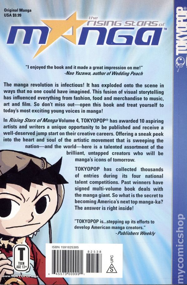 Volume 4 - 1st printing. Collects the winning and best manga-inspired stories from Tokyopop's "Rising Stars of Manga" contest for aspiring American writers and artists. Includes: 01: "Bombos Versus Everything" 02: "Down" 03: "The Hopeless Romantic and the Hapless Girl" 04: "Work Bites" 05: "Shotgun" 06: "The Østberg Study" 07: "Hellbender" 08: "La Masque" 09: "Beyond the bird" "Where are They Now" "Rising Stars of Manga Tips" Softcover, 5-in. x 7-in., 232 pages, B&W. Cover price $9.99.