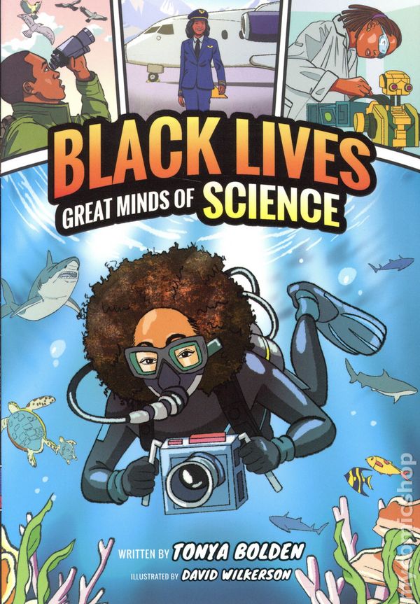 1st printing. Written by Tonya Bolden. Art and cover by David Wilkerson. Black Lives is an exciting new graphic novel series from award-winning author Tonya Bolden and illustrator David Wilkerson. Great Minds of Science celebrates the lives and contributions of Black scientists throughout history. Matilda Evans (physician). Archie Alexander (civil engineer). Gladys West (mathematician). Ayana Elizabeth Johnson (marine biologist). These aren't names that many people learn about in school, but they're some of the greatest scientists that people should know about-doctors, engineers, mathematicians, and biologists. Each of them faced challenges as they rose to the top of their professions, but they didn't back down. Softcover, 5 1/2-in. x 8-in., 128 pages, full color. Cover price $8.99.