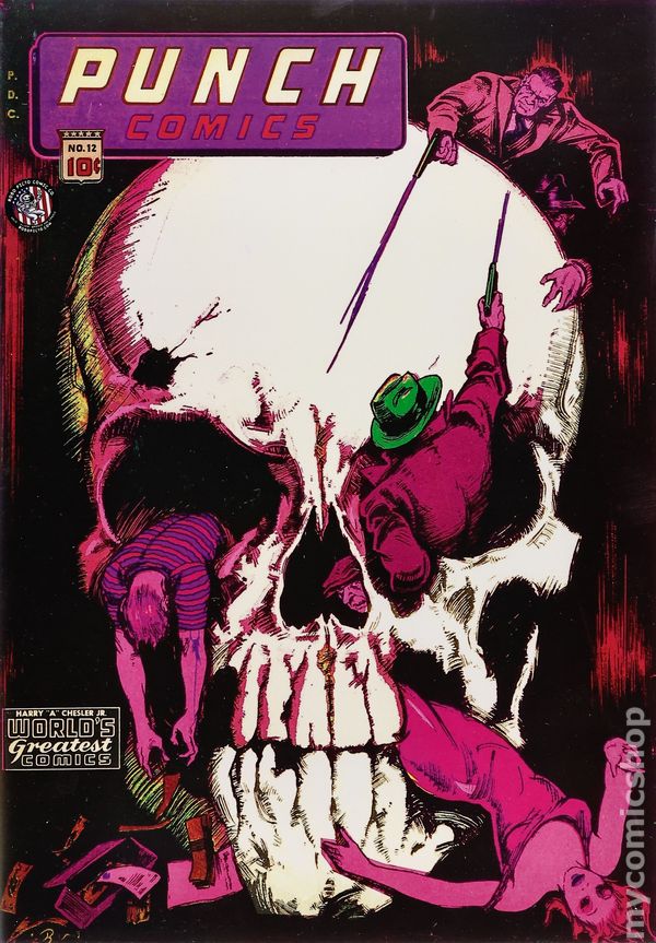 Robo Picto Comics Photo-Copied Reprint of Punch Comics (1941 Chesler/Dynamic) #12 - limited to 100 copies. Cover by Gus Ricca. Stories and art by Joe Beck, Otto Eppers and Bernard Sachs. An early superhero and adventure anthology published by Harry Chesler. Master Key uses his X-ray vision to seek an emerald stolen from an antiques dealer and clear a reformed ex-convict. Captain Glory investigates after skeletal horsemen with the touch of death attack a mine. Rocketman bequeaths his flying suit to young Billy Wood after Billy's father disappears in the jungle, and Rocketboy is born. Wicked cover by Gus Ricca. Punch & Cutey; Master Key; Captain Glory; Sacrifice; Happy Landing; Hale the Magician; Handy Andy; Yankee Boy: Gambler's Payoff; Rocketboy. 52 pages, Full Color.