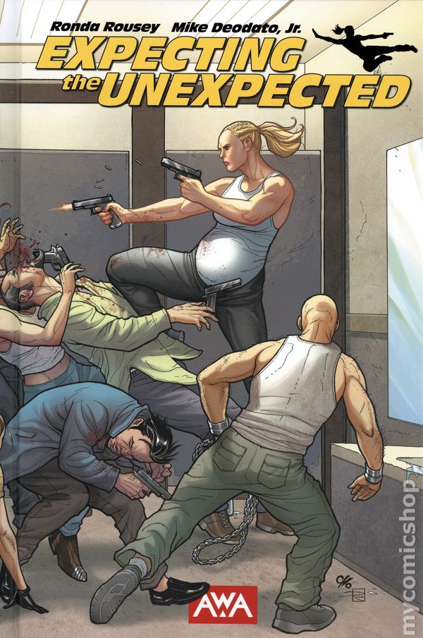 Oversized Hardcover Edition. Frank Cho Variant Cover. Written by Ronda Rousey. Art by Mike Deodato. Cover by Razzah. Back Cover by Mike Deodato. Her codename: "Mom." With a fake baby bump filled with guns, she's built a reputation as one of the deadliest hit-women on the planet. But on the verge of her big break in the criminal underworld, Mom makes a fateful decision: sleeping with a potential target (who just so happens to be a top-ranked assassin himself). What follows is a wild mashup of action, adventure, comedy, and romance as a newly pregnant Mom with a bounty on her head fights off wave-after-wave of assassins, falls in love with her baby daddy, and decides how to face her personal and professional predicament. Hardcover, 168 pages, full color. Mature Readers Cover price $75.00.
