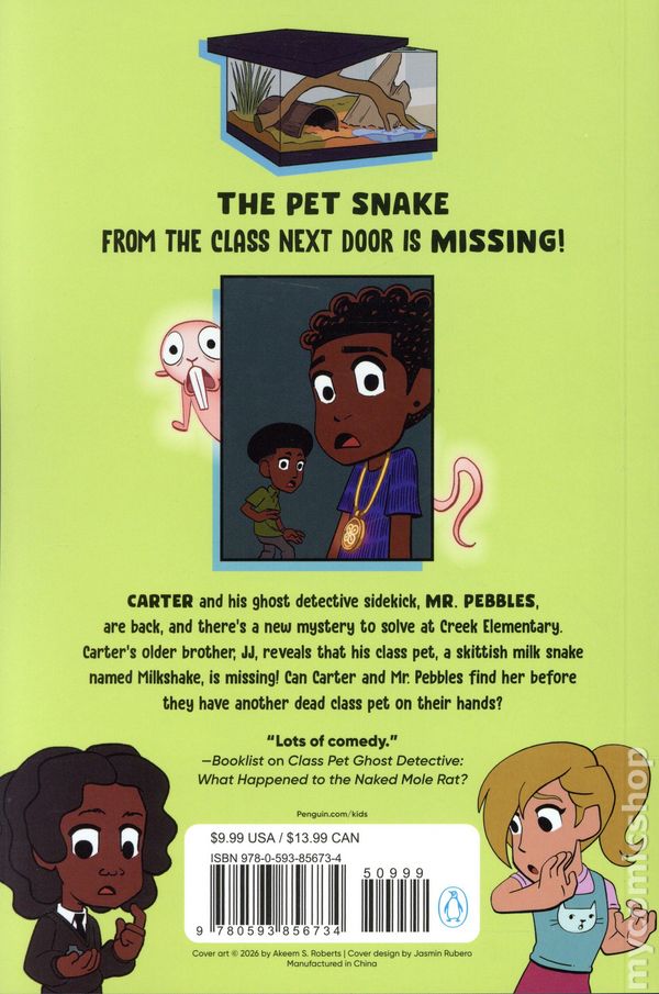 Volume 2 - 1st printing. "Milkshake the Disappearing Milk Snake!" Story and art by Akeem S. Roberts. An eight-year-old boy solves mysteries with the ghost of his former class pet, a naked mole rat, in this funny supernatural graphic novel series for early readers. The pet snake from the class next door is missing! Carter and his ghost detective sidekick, Mr. Pebbles, are back, and theres a new mystery to solve at Creek Elementary. Carters older brother, JJ, reveals that his class pet, a skittish milk snake named Milkshake, is missing! Can Carter and Mr. Pebbles find her before they have another dead class pet on their hands?! Dont miss more class pet capers in this graphic novel series coming soon. Softcover, 5 1/2-in. x 8-in., 96 pages, full color. Age 6-8 years Cover price $9.99.