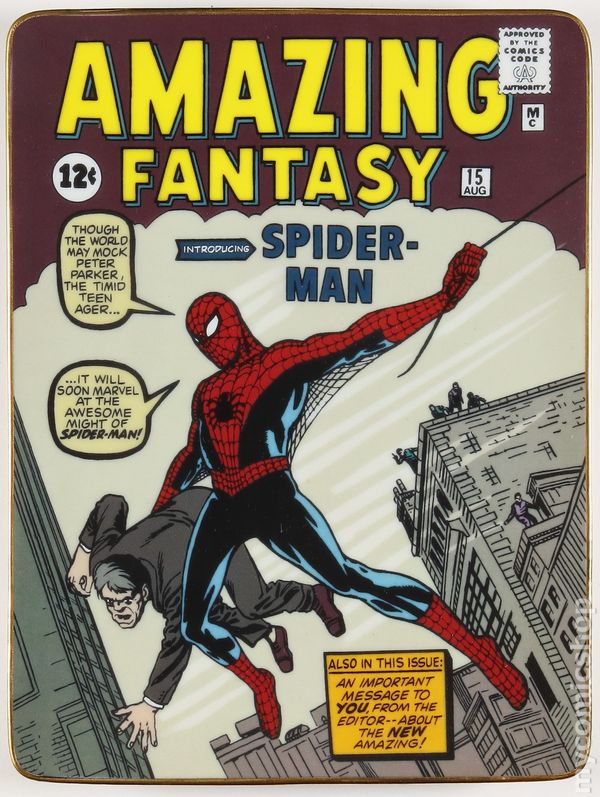 Collector Plate depicting the cover of Amazing Fantasy #15, Spider-Man's first appearance. Gorgeous full-color with all edges trimmed in 24K gold. Each plate in this series was individually numbered on the reverse. Produced by Franklin Mint in 1997, 6.25" x 8.5", full-color.