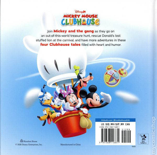 1st printing. Hot dog, its finally here! A collection of favorite Mickey Mouse Clubhouse stories! Its time for reading fun with Mickey and his pals with this collection of 4 Mickey Mouse Clubhouse stories, pefect for preschool-aged fans of the hit Disney Junior show. Join Mickey and the gang on four fun Clubhouse tales filled with heart and humor in this illustrated 96-page hardcover storybook. Young fans will have a blast following the Sensational Six on their adventures as they use their imaginations and work together with their pal Toodles. Read along as Mickey and the gang take to the skies on a high-flying hot air balloon journey, support Minnie in her big concert, go on an out of this world treasure hunt, and help Donald find his lost stuffed lion at the carnival! With a compact size and sturdy hardcover binding, Oh, Toodles! is perfect for storytime anytime and anywhere—making it easy to establish a reading routine with your 3-to-5 year-old. Super cheers! Oh, Toodles! 4-in-1 Storybook includes: Up, Up, and Away - Pop Star Minnie - Space Adventure - Clubhouse Carnival. Hardcover, 8 1/4-in. x 8 1/4-in., 96 pages, full color. All Ages Cover price $12.99.