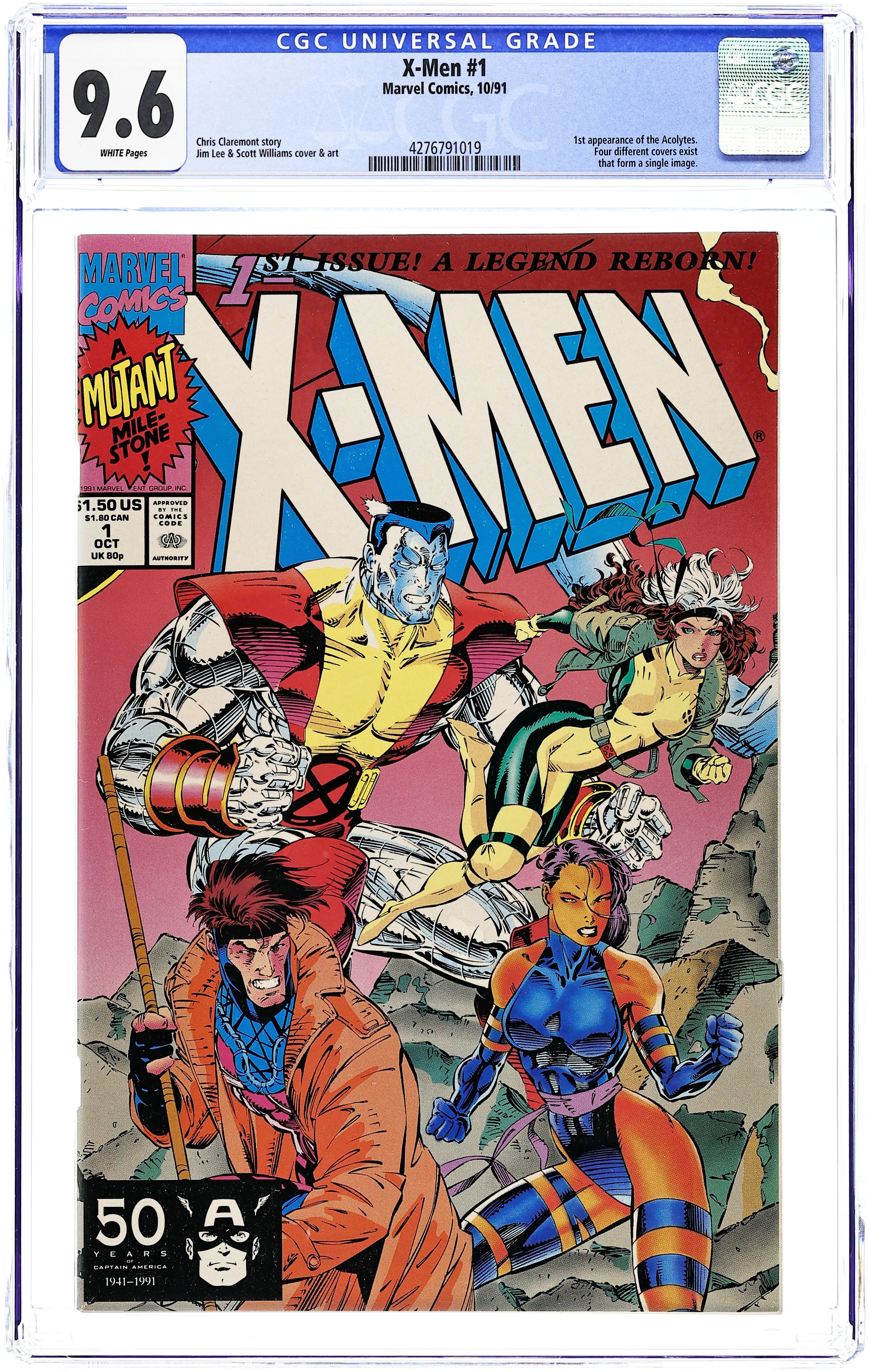 Starts Jan 26 Direct Edition. Colossus/Gambit/Psylocke/Rogue cover. Cover pencils by Jim Lee (signed), inks by Scott Williams. Rubicon, script by Jim Lee (Co-Plot) and Chris Claremont, pencils by Jim Lee, inks by Scott Williams; Magneto forms the Acolytes and proclaims Asteroid M a haven for mutants everywhere; But the rest of the world doesn't see it that way; Nick Fury cameo. 2-page pin-up: gallery of X-Men villains. X-Men Sketchbook by Jim Lee. Cover price $1.50. NOTE: Cover B connects to covers 1A, 1C, and 1D to form a single giant image. Cover price $1.50.