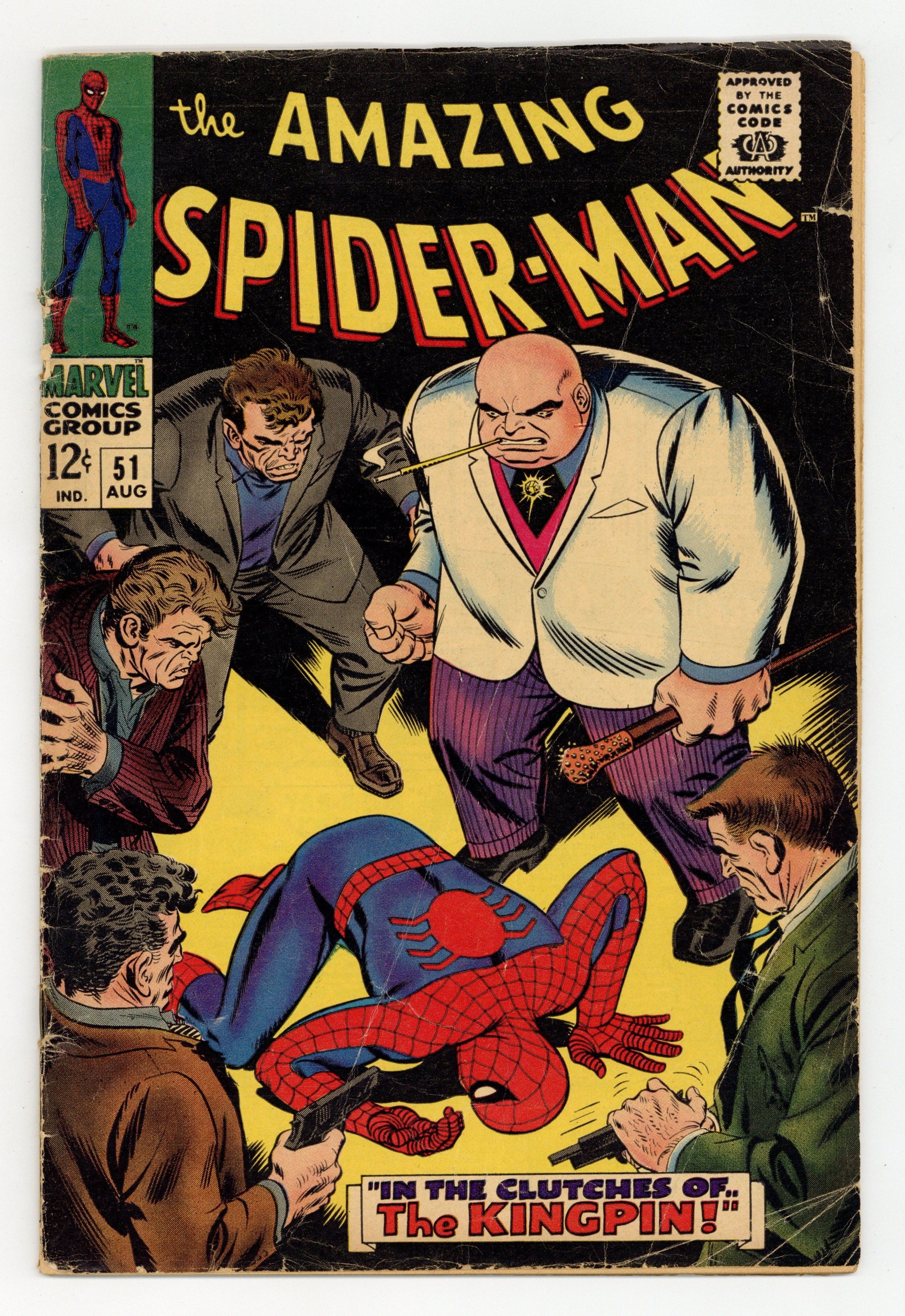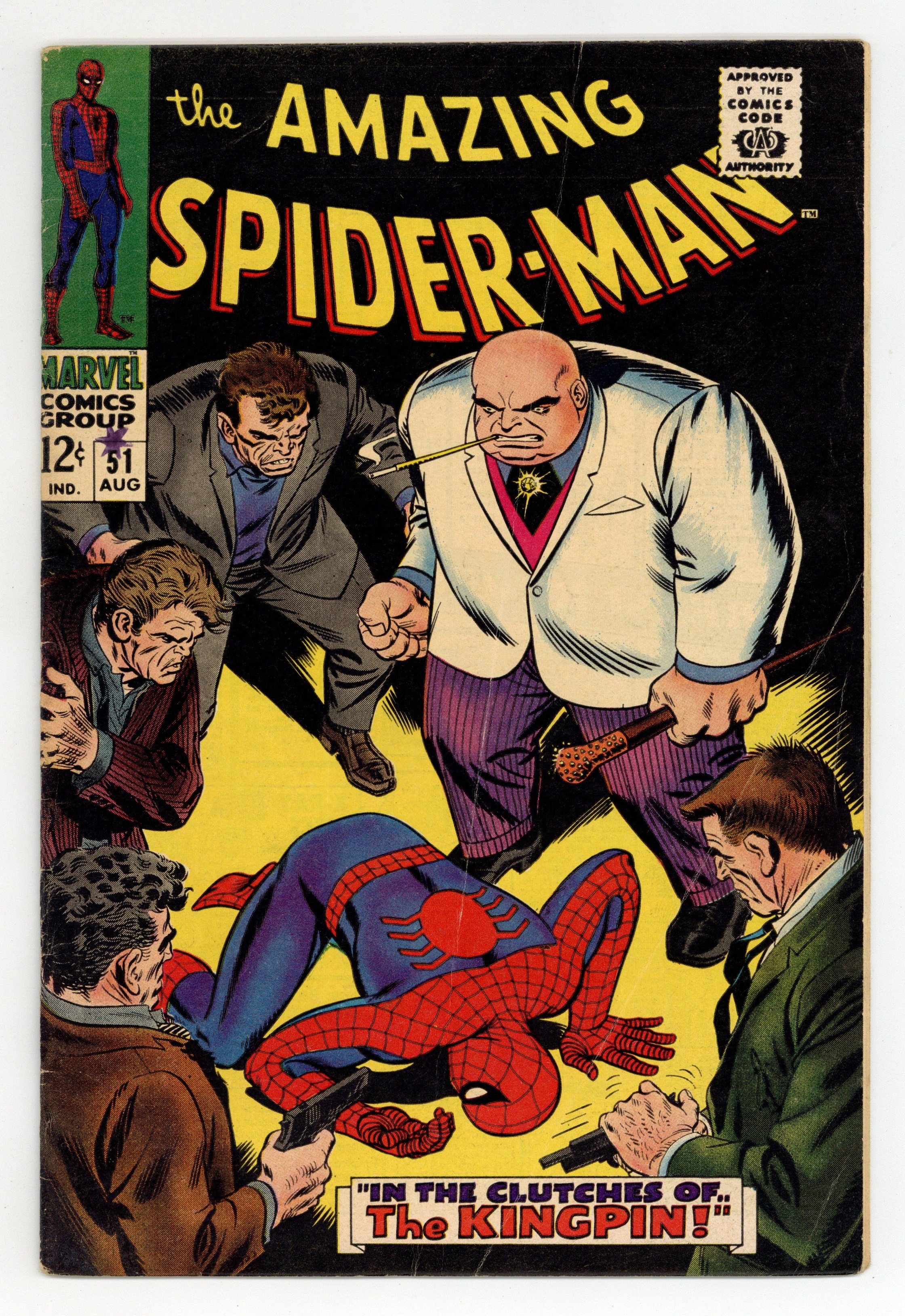 Starts Feb 9 Cover by John Romita Sr. Second appearance of the Kingpin in In the Clutches of...the Kingpin!, script by Stan Lee, pencils by John Romita, inks by Mike Esposito (as Mickey Demeo); When the Kingpin orders that J. Jonah Jameson be silenced for his negative press on Fisk's illegal activites, Spidey swings in to save the EIC; But can the Wallcrawler take the big guy in a one-on-one brawl? Reprinted in Marvel Tales # 36. 36 pages, full color. Cover price $0.12.