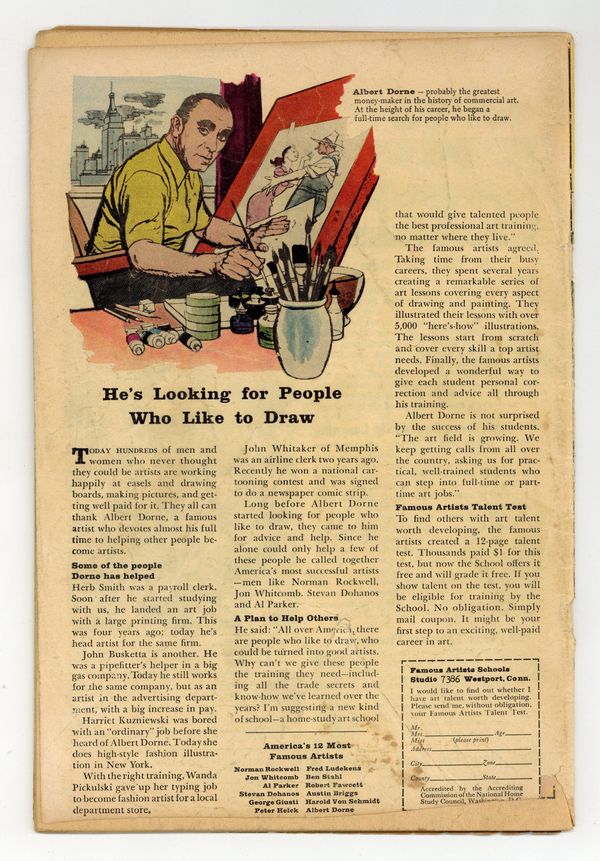 Starts Jan 26 Cover by Jack Kirby. What Was "X" the Thing That Lived! Part 1, art by Jack Kirby and Dick Ayers; A comic writer's monsters keep coming to life, until he creates one that can't be defeated. What Was "X" the Thing That Lived! Part 2, art by Jack Kirby and Dick Ayers. What Was "X" the Thing That Lived! Part 3, art by Jack Kirby and Dick Ayers. What Was "X" the Thing That Lived! Part 4, art by Jack Kirby and Dick Ayers. Odd Skills text story, art by Joe Maneely. One-Way Journey!, art by Steve Ditko; A heartless tycoon spends great resources and eliminates jobs in order to build a machine that will transport him from the current moment to one forty years hence because his scientists have predicted an end to disease, war, and poverty in the year 2001. 36 pgs., full color. $0.10. Cover price $0.10.