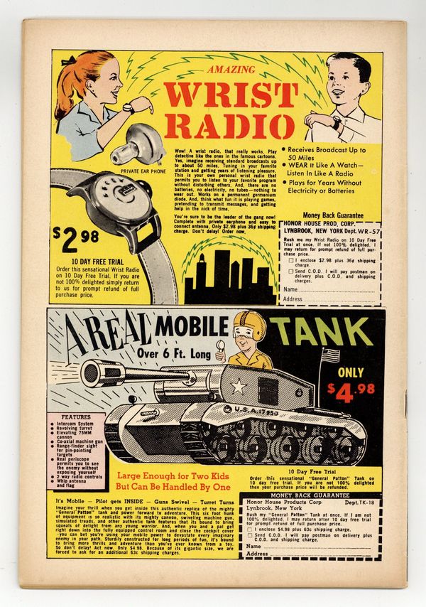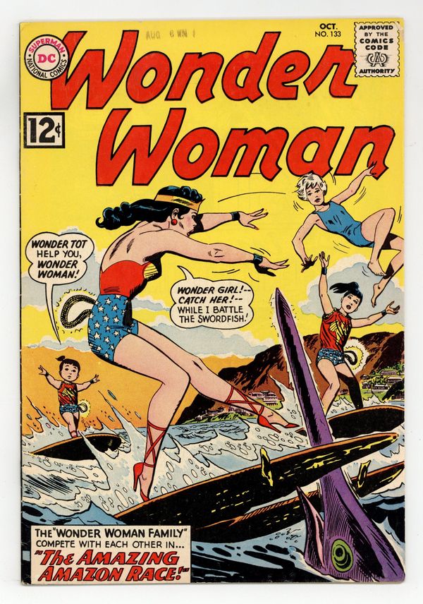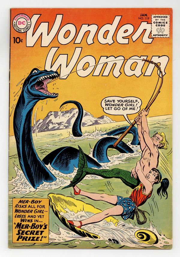 Starts Jan 26 Cover pencils by Ross Andru, inks by Mike Esposito. "Mer-Boy's Secret Prize," script by Robert Kanigher, pencils by Ross Andru, inks by Mike Esposito; Mer-Boy, trying to win the heart of Wonder Girl, participates in an Atlantean contest to win a pearl tiara by catching the most unusual fish; Instead, she has to save him when he accidentally catches a giant bird; Later, she has to intervene again when he catches a giant sea monster; Another Atlantean wins the pearl tiara for his girl. Superman Annual ad. "Three Wishes of Doom," script by Robert Kanigher, pencils by Ross Andru, inks by Mike Esposito; Inez Grey, a star athlete at Holliday College, beats Etta Candy and her three friends in bouts of swimming, jumping, tennis, and fencing; When Wonder Woman comes to console the Holliday Girls, Inez tells her that she could do anything Wonder Woman can do if she only had the use of her bracelets, tiara, and lasso. Wonder Woman refuses to lend her equipment to the girl. 36 pages, Full Color. Cover price $0.10.