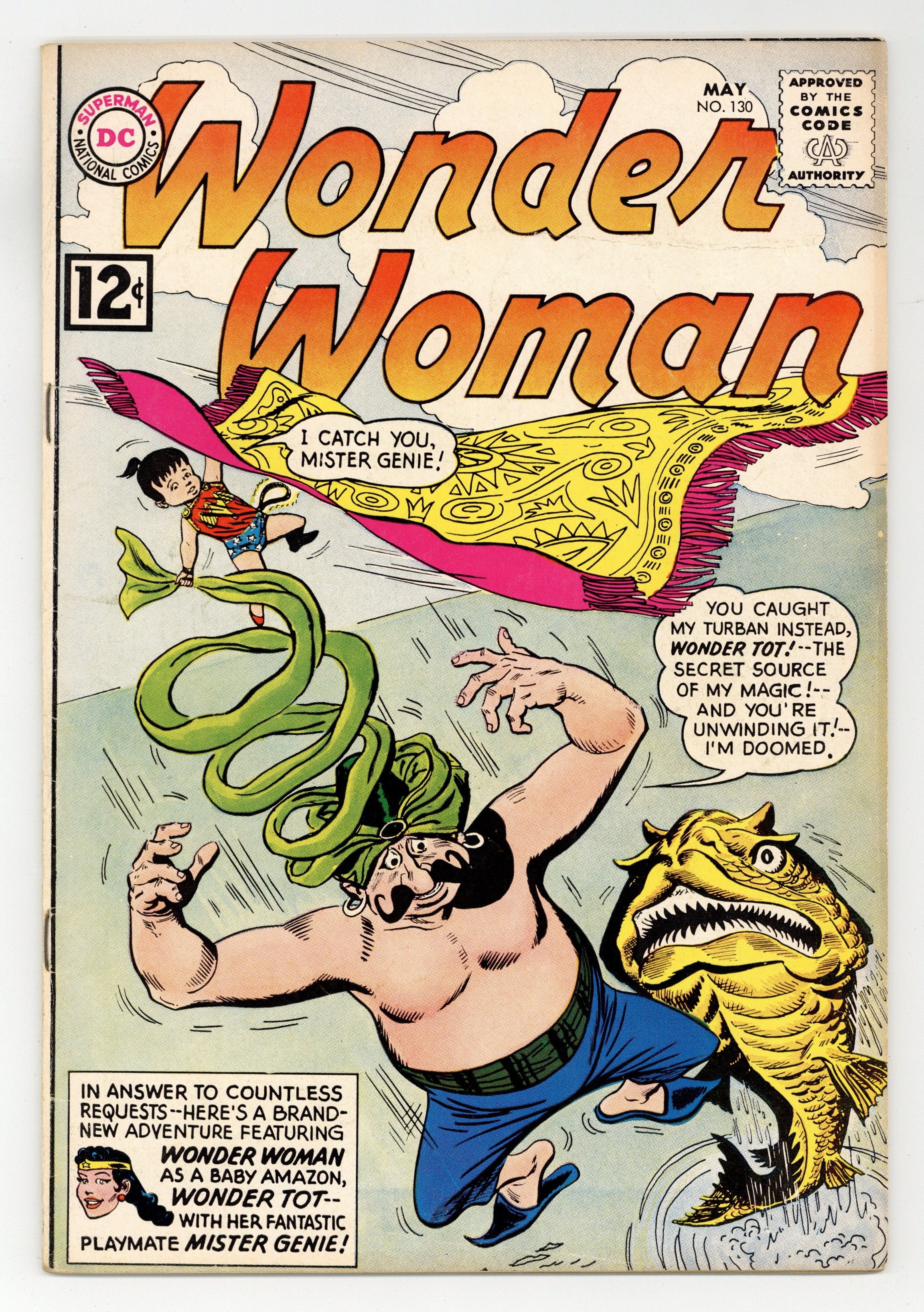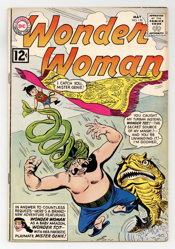 Starts Jan 26 Cover pencils by Ross Andru, inks by Mike Esposito. "Secret of Mister Genie's Magic Turban," script by Robert Kanigher, pencils by Ross Andru, inks by Mike Esposito; Mr. Genie takes Wonder Tot on another series of adventures, during which they foil an alien invasion attempt. "The Mirage Mirrors," script by Robert Kanigher, pencils by Ross Andru, inks by Mike Esposito; After Diana Prince finds that Steve Trevor is too dumb-struck with love for Wonder Woman to consider taking her out, she asks Queen Hippolyte for advice; She tells her daughter how, when Hercules was smitten with her, and did nothing but brag to her of Hippolytes beauty while the Queen assumed a secret identity as an Amazon soldier, she fooled him with a "mirage-mirror" that gave her two heads, allowing her to assume any shape she wished temporarily. Letter to the editor from comics historian Peter Sanderson. 36 pages, Full Color. Cover price $0.12.