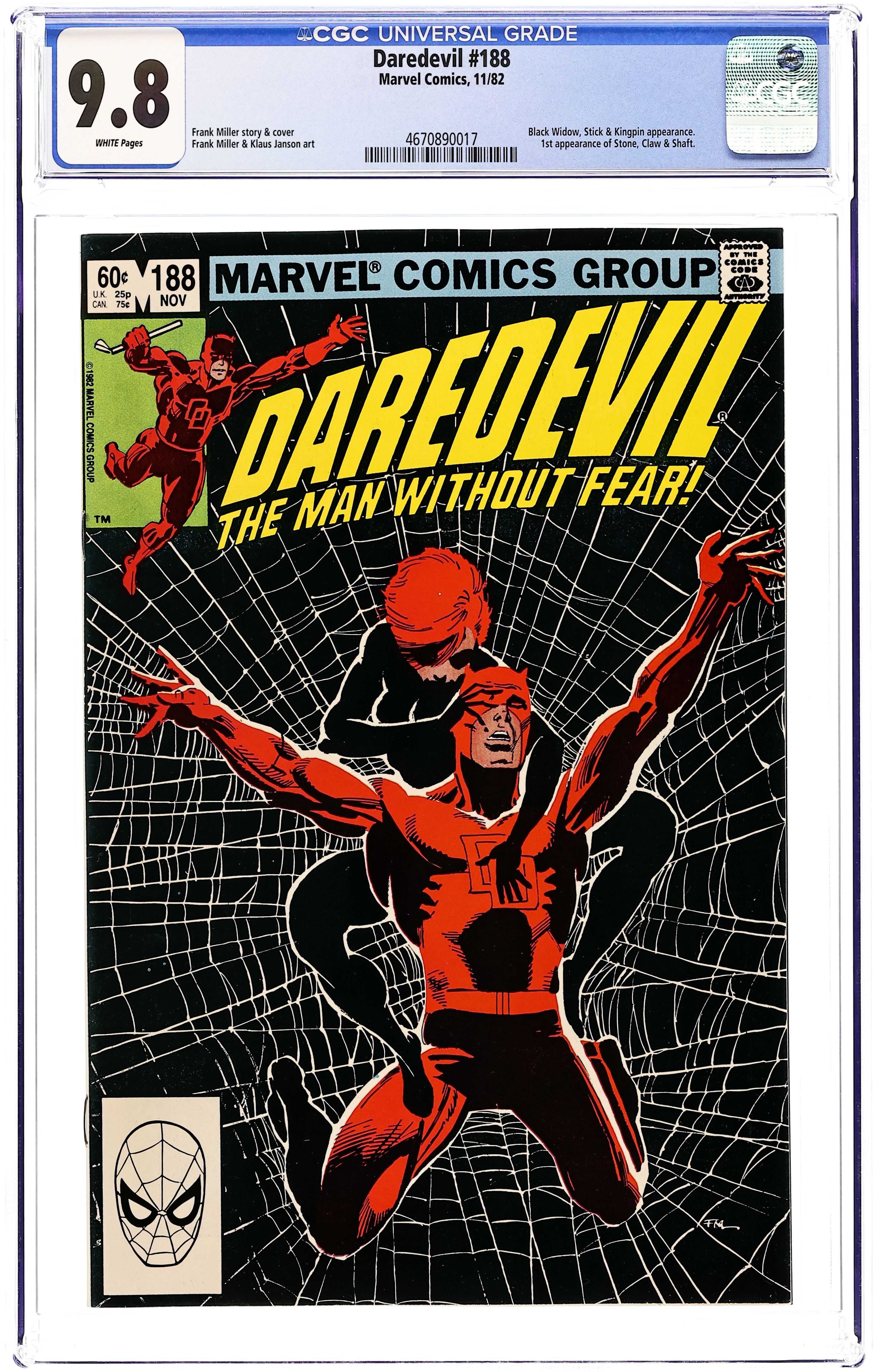 Cover pencils by Frank Miller, inks by Klaus Janson. Overkill, script by Frank Miller, pencils by Frank Miller (layouts) and Klaus Janson (finished art), inks by Klaus Janson; DD's hyper senses continue to get worse and he seeks out Stick for help; in a fight with the Hand, the Black Widow is poisoned; appearances by the Black Widow (in a new costume), Nick Fury, and ninja assassins. 36 pgs. Cover price $0.60. Cover price $0.60.