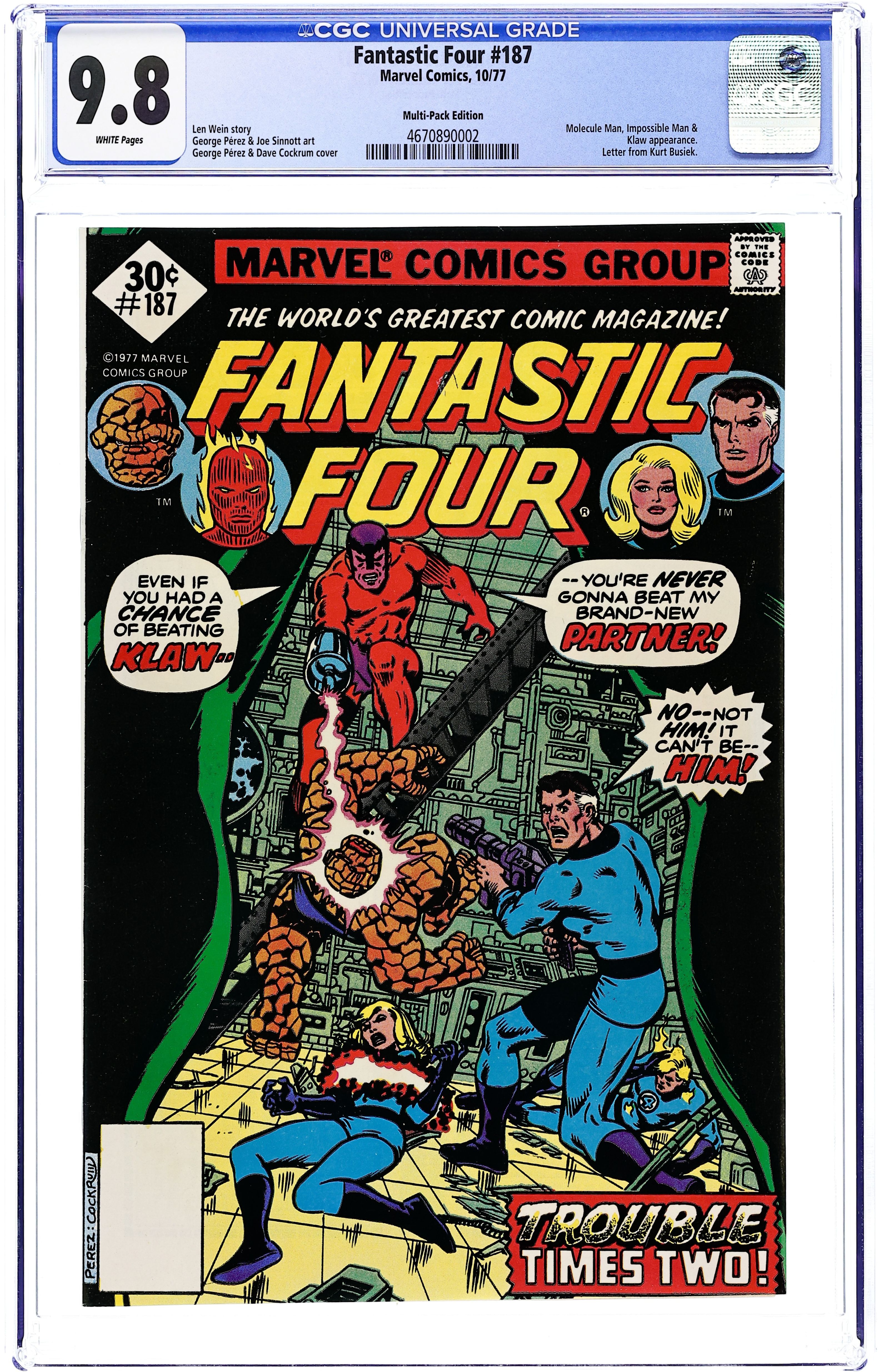 Whitman Variant. "Trouble Times Two!" Part 1 of 2. Script by Len Wein. Art by George Perez (breakdowns) and Joe Sinnott (finishes). Cover by George Perez and Dave Cockrum. The Fantastic Four return from Colorado and discover the Impossible Man knocked out cold. The Thing begins a room-by-room search of the Baxter Building and discovers the FF's long-time foe...Klaw! But the murderous master of sound is not alone! He has a new partner...the all-powerful Molecule Man! In Reed's electro-lab, the FF and the deadly duo battle for control of the psi-amplifier! Will the FF grasp victory? Or will it be just out of reach? Flashback cameo by the Man-Thing to recap the Molecule Man's previous appearance in Iron Man Annual 3. Last 30¢ issue. (Note: The letters page includes a letter from comics writer Kurt Busiek. A 35-cent cover price variant exists for this issue.) 32 pages Cover price $0.30.