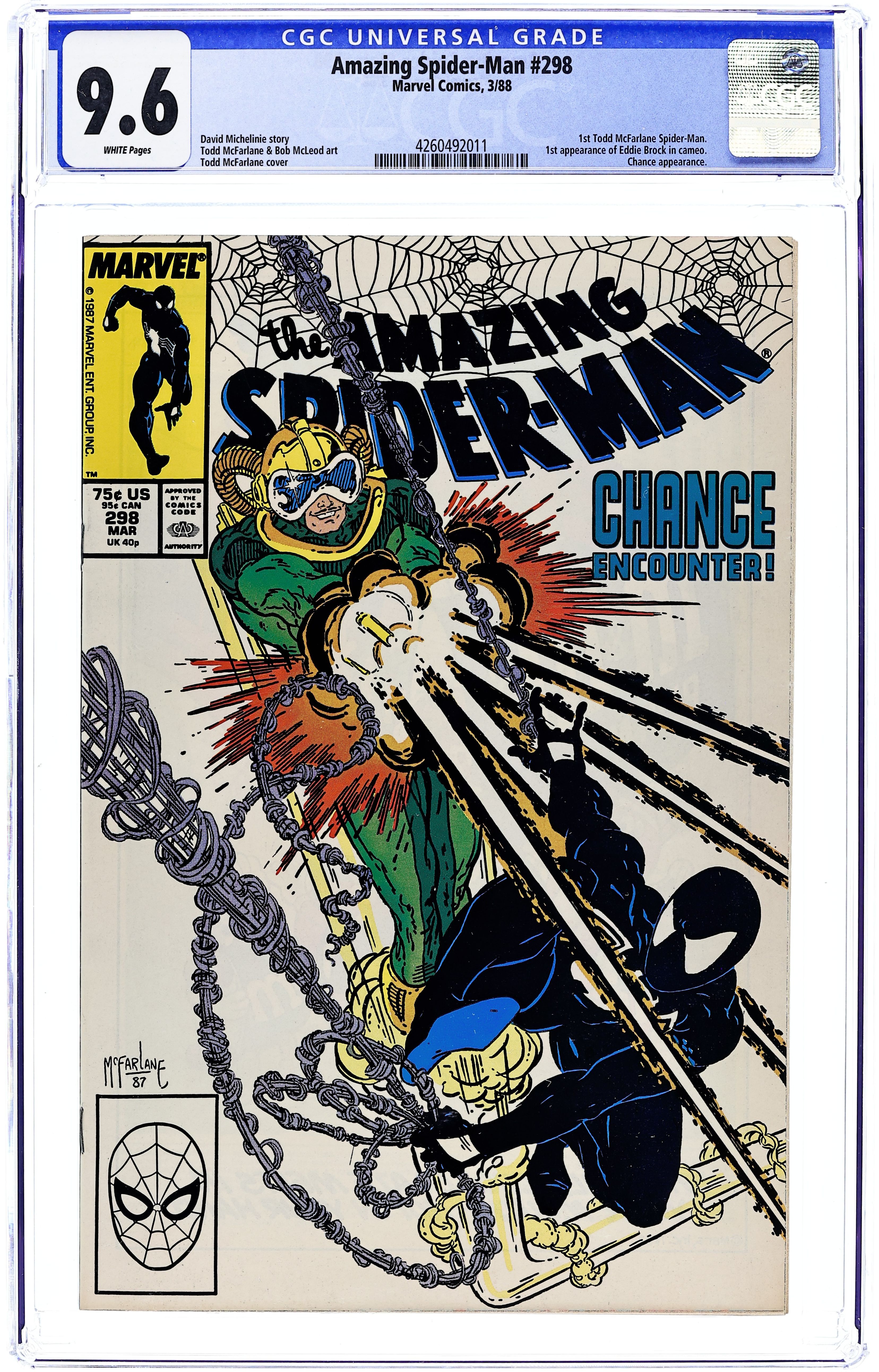 Starts Jan 19 Direct Edition. "Chance Encounter!" Part 1 of 2. Script by David Michelinie. Pencils by Todd McFarlane. Inks by Bob McLeod. Cover by Todd McFarlane. Chance is back in business and working a new job for the Life Foundation! The clandestine organization wants Chance to steal an arms shipment coming into the west side docks! That should be a piece of cake for the high-flying mercenary! However, the Daily Bugle dispatches an undercover photographer to observe the delivery! And beneath the moonlit sky, fireworks explode when Chance and the Amazing Spider-Man throw down on the docks! First appearance (and cameo on the last page) by Eddie Brock (aka Venom). First appearance of Carlton Drake of the Life Foundation. Cameo appearances by Mary Jane Watson, Joy Mercado, and Joe Robertson. (Notes: Chance previously appeared in Web of Spider-Man 15. This issue begins Todd McFarlane's 2-year run as the penciler of the Amazing Spider-Man series.) 36 pages. Cover price $0.75.