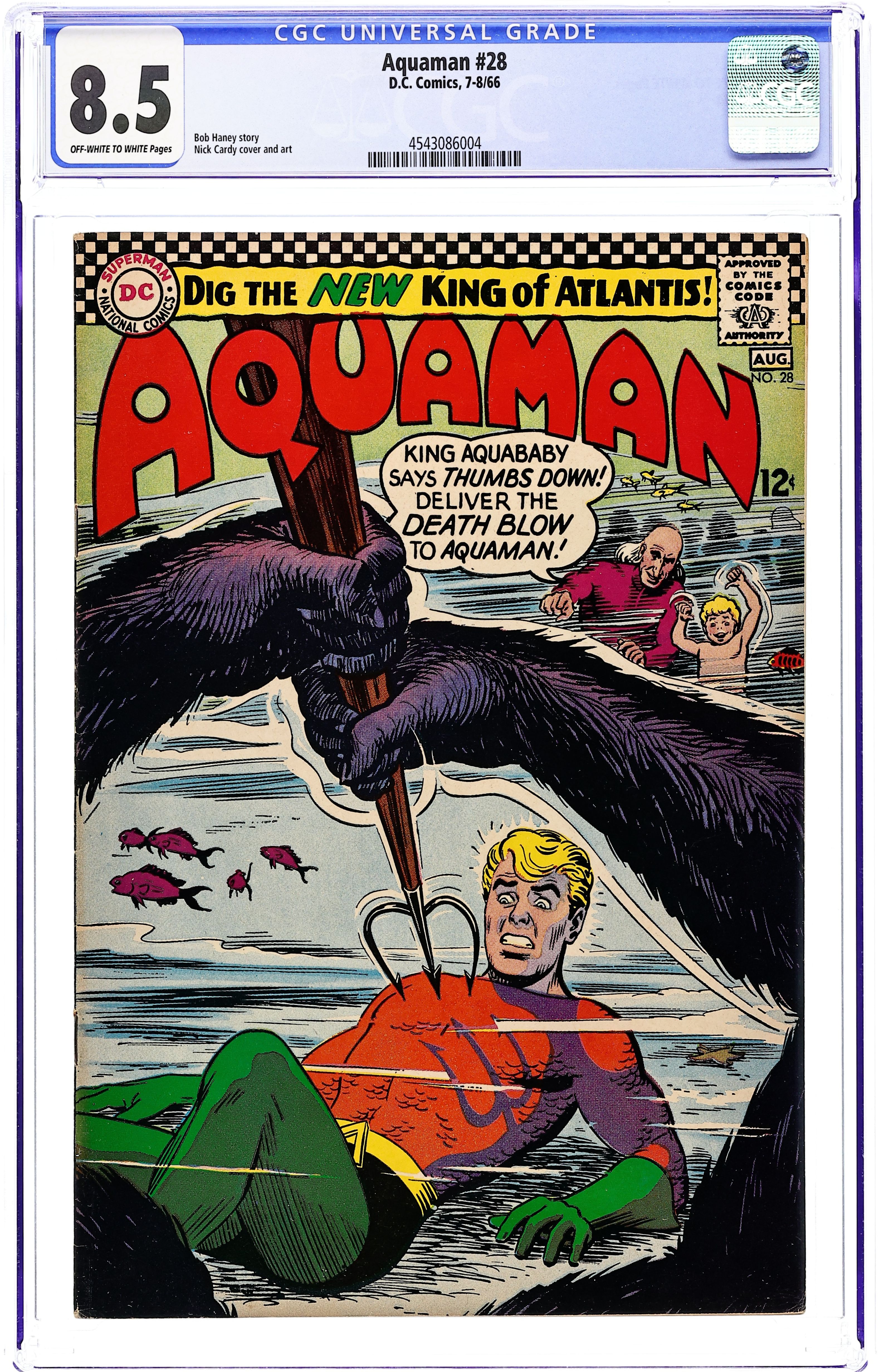 Cover art by Nick Cardy. Hail Aquababy, New King of Atlantis! starring Aquaman, Aqualad, Mera, Aquababy, Topo, Sea Imp, Dr. Starbuck, Boduhr, and Krakka, script by Bob Haney, art by Nick Cardy; Dr. Starbuck rescues Aquaman from an underwater landslide and then declares war on the surface world; in Aquaman's absence, Aquababy is king of Atlantis. 36 pgs. $0.12. Cover price $0.12.