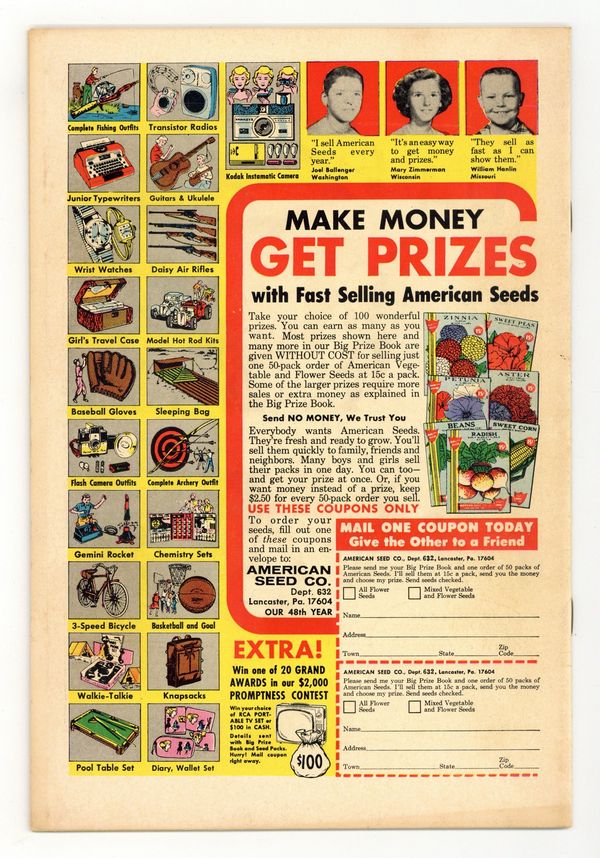 Starts Jan 19 Written by Gardner Fox. Art by Carmine Infantino and Sid Greene. Cover by Carmine Infantino and Murphy Anderson. The Round-Robin Death Threats; Someone has sent hypnotic letters to several people, including Bruce Wayne, and booby trapped some of their possessions so they will end up killing each other. Written by John Broome. Art by Carmine Infantino and Sid Greene. Robber Round-Up in Kiddy City!; Sue gets suspicious of Mr. Booth and has Ralph follow him to a crime scene; Mr. Booth turns out to be a bystander but Ralph captures some thieves anyway. Ad for Lone Ranger plastic model kits from Aurora Plastics Corp. Ad for The Brave And The Bold #73. Letter to the editor from comics historian Peter Sanderson Jr. Ad for 80 Page Giant Jimmy Olsen #104. 36 pgs. Cover price $0.12.