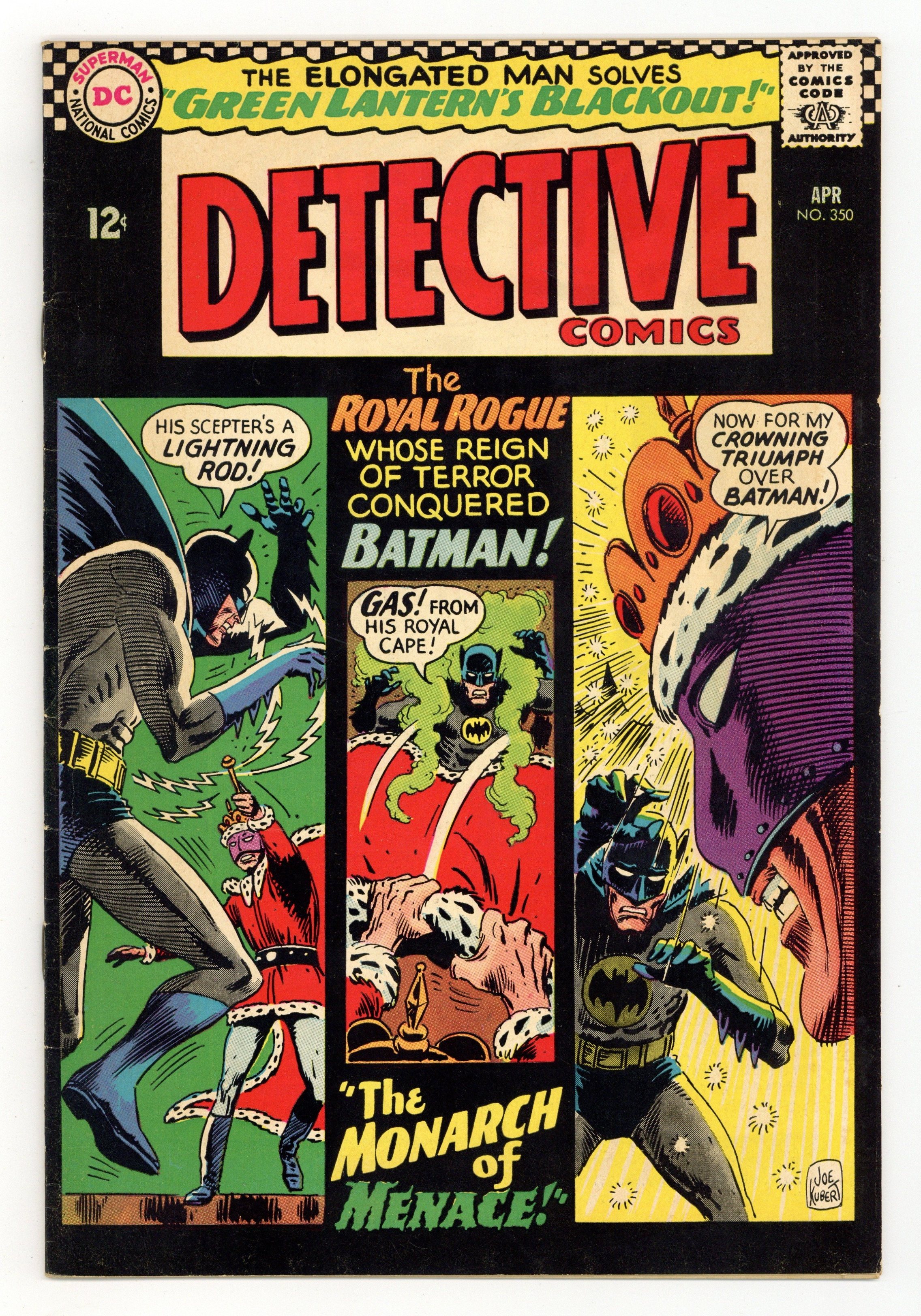 Starts Feb 2 Written by Bob Kanigher. Art by Sheldon Moldoff and Joe Giella. Cover by Joe Kubert. The Monarch of Menace!; the Monarch of Menaces son dons his dads costume and goes up against Robin; Batman battles the real Monach. Written by Gardner Fox. Art by Carmine Infantino. Green Lantern's Blackout!; Thomas Kalmaku, aka Pieface, contacts The Elongated Man is to help his friend, Green Lantern. Casey the Cop humor page by Henry Boltinoff. Cap's Hobby Hints by Henry Boltinoff. 36 pages, full color. $0.12. Cover price $0.12.
