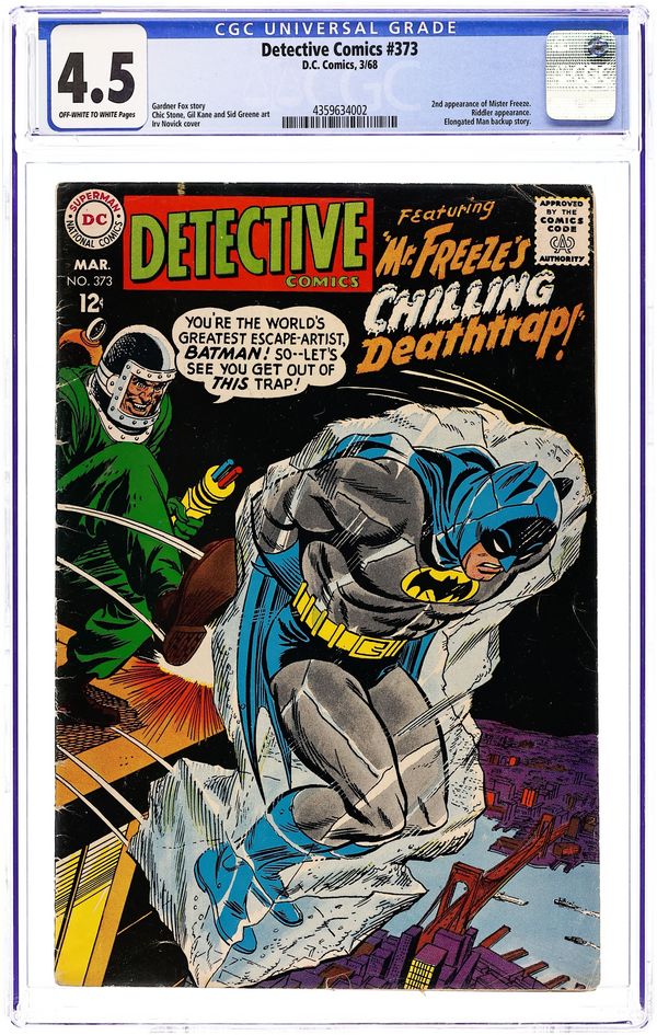 Written by Gardner Fox. Art by Chic Stone (ghosting for Bob Kane) and Sid Greene. Cover art by Irv Novick. Mr. Freeze's Chilling Deathtrap!; Aunt Harriet needs cryosurgery to save her life; unfortunately, the freezing machine in the hospital breaks; enter Mr. Freeze, who could help; Batman fights Mr. Freeze. Written by Gardner Fox. Art by Gil Kane and Sid Greene. The Riddler on the Roof!; while visiting Gotham City, Ralph Elongated Man Dibny answers the Bat-Signal, hoping to meet Batman and Robin; unfortunately, Batman is out of town; Elongated Man battles the Riddler. Statement of ownership--average print run 665,000; average paid circulation 426,300. Letter to the editor from Irene Vartanoff. 36 pages, full color. $0.12. Cover price $0.12.