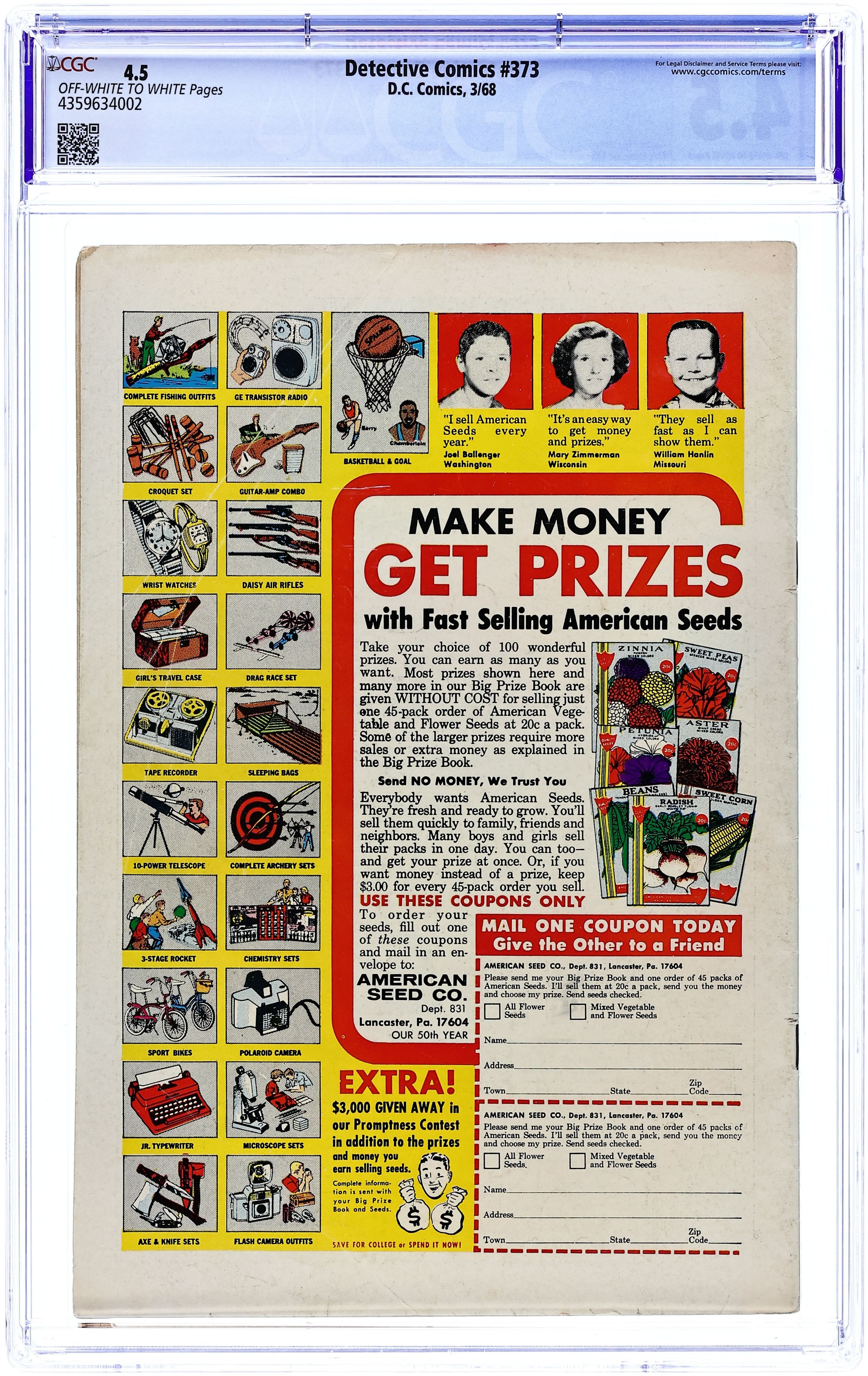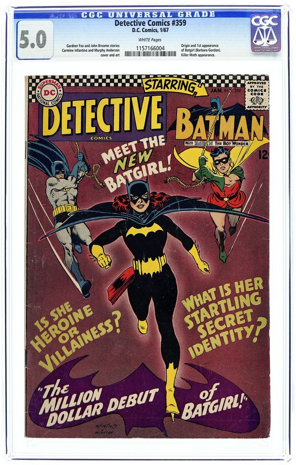 Written by Gardner Fox. Art by Carmine Infantino and Sid Greene. Cover by Carmine Infantino and Murphy Anderson. 1st appearance of the new Batgirl (Barbara Gordon) in The Million Dollar Debut of Batgirl!; Batgirl goes to a costume party dressed as Batgirl; she sees Killer Moth attack Bruce Wayne. Written by Gardner Fox. Art by Murphy Anderson. Riddle of the Sleepytime Taxi!; Ralph Elongated Man Dibny and Sue fall asleep in the back seat of a taxi while going to a costume party; Ralph discovers that crooks criminals are putting passengers to sleep to copy secret documents. Cap's Hobby Hints activity page by Henry Boltinoff. Letter to the editor from comics writer Mark Evanier. 36 pages, full color. $0.12. Cover price $0.12.