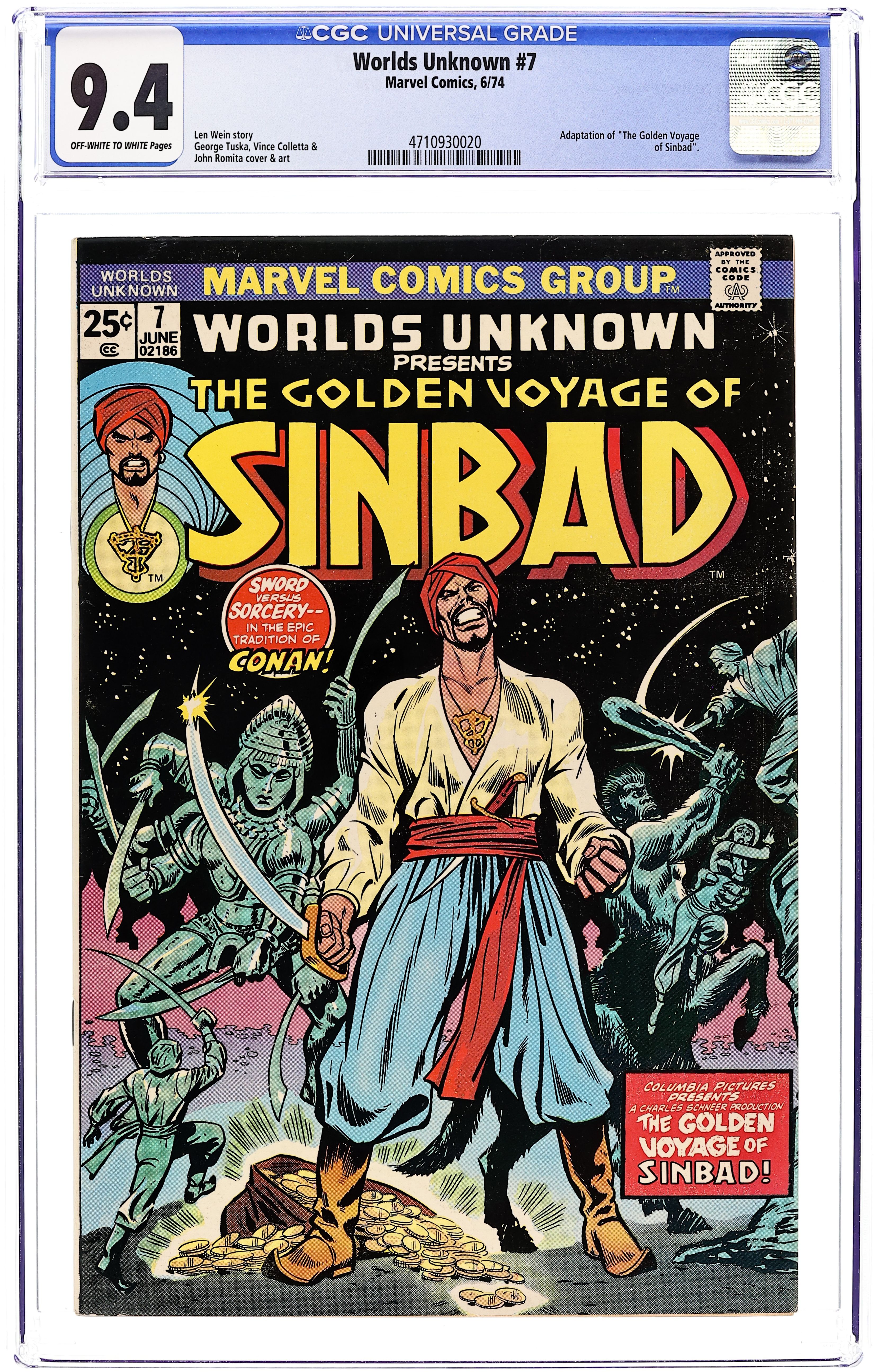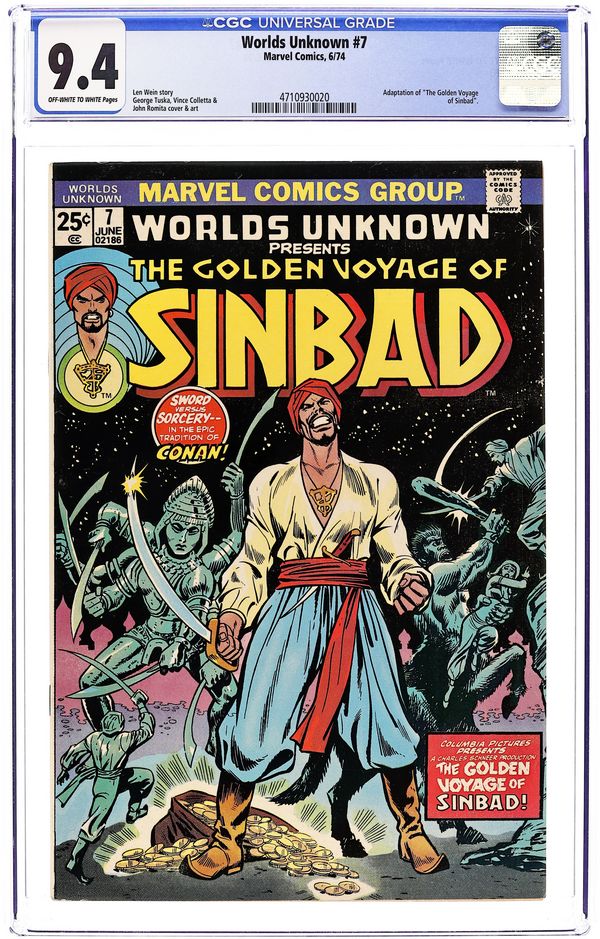 First 25c cover-priced issue. The Golden Voyage of Sinbad! (Part 1 of 2) - Written by Len Wein (adapted from the screenplay by Brian Clemens). Art by George Tuska, Vince Colletta and John Romita (splash page). Cover by George Tuska, Vince Colletta and John Romita (alterations). Sword vs. sorcery -- in the epic tradition of Conan! Adaptation of the thrilling Columbia Pictures film! Concludes next issue. Characters: Sinbad; Rachid; Omar; Abdul; Achmed; Prince Koura; Grand Vizier; Hakim; Haroun; Margiana; Akbar. Also: Marvel Value Stamp Series A #32 (The Red Skull). 32 pages, full color. Cover price $0.25.