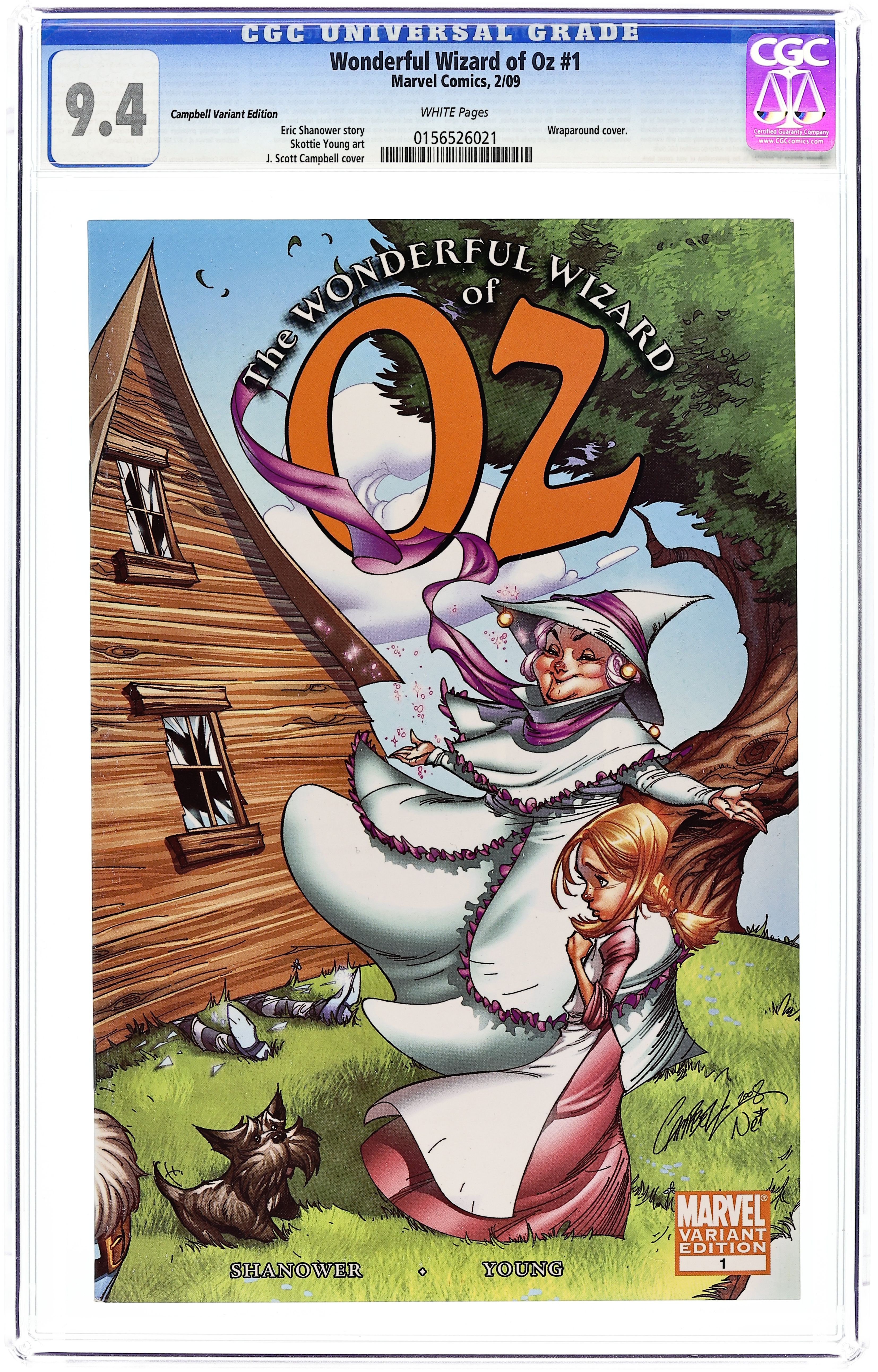 Limited Villian Variant by J. SCOTT CAMPBELL. Written by ERIC SHANOWER Pencils by SKOTTIE YOUNG. The premiere American fantasy adventure gets the Merry Marvel treatment! Eisner Award-winning writer/artist Eric Shanower (Age of Bronze) teams up with fan-favorite artist Skottie Young (New X-Men) to bring L. Frank Baum's beloved classic to life! When Kansas farm girl Dorothy flies away to the magical Land of Oz, she fatally flattens a Wicked Witch, liberates a living Scarecrow and is hailed by the Munchkin people as a great sorceress...but all she really wants to know is: how does she get home? 32 PGS./All Ages Cover price $3.99.