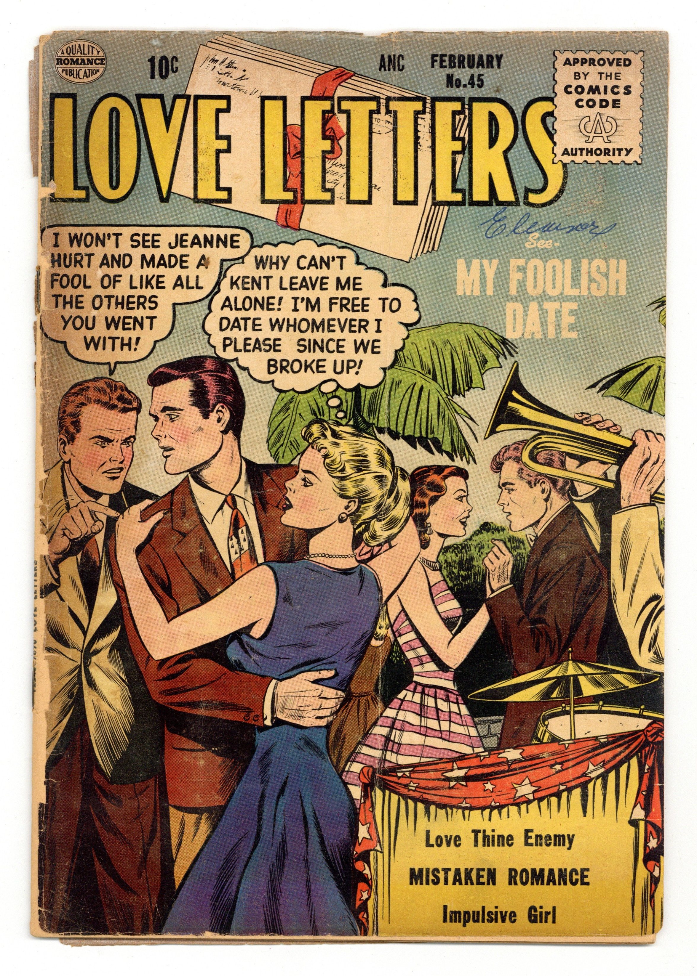 Ends Feb 16 9:04 PM CST Bid History 3 bids Current Bid $6 Your Secret Max Bid If you'd like to bid, please log in or register. "My Searching Heart!"; In 1944, military nurse Alice and soldier Vince fall in love on a Pacific island but are separated when the nurses are evacuated; She is later told that he was killed, but they are reunited when hes released from a POW camp at the end of the war. "My Love Will Seek Me Out!", inks by Irv Novick and Frank Giacoia; Celia is rescued from the sea by Amos, but has amnesia; A newspaper photo of Wally and his fiance Julia helps Celia recover her memory: she was on vacation and fell in love with Wally, but fell off his boat in a storm. "Voodoo Love" text story. "The Courtship of Miles Standish" half-page story, art by Jerry Grandenetti; John tries to help unite Miles and Priscilla, only to fall in love with Priscilla himself. "Love Adrift," pencils by Mort Leav, inks by Bob Rogers; Meg and her aunt, touring Europe, are rescued from a Parisian political demonstration by fellow American Carl, a merchant seaman; Meg and Carl fall in love, but Megs aunt tries to keep them apart, and books passage home, unaware its on Carls ship. "Evangeline" one-page story, art by Reed Crandall. 36 pgs., full color. Cover price $0.10.