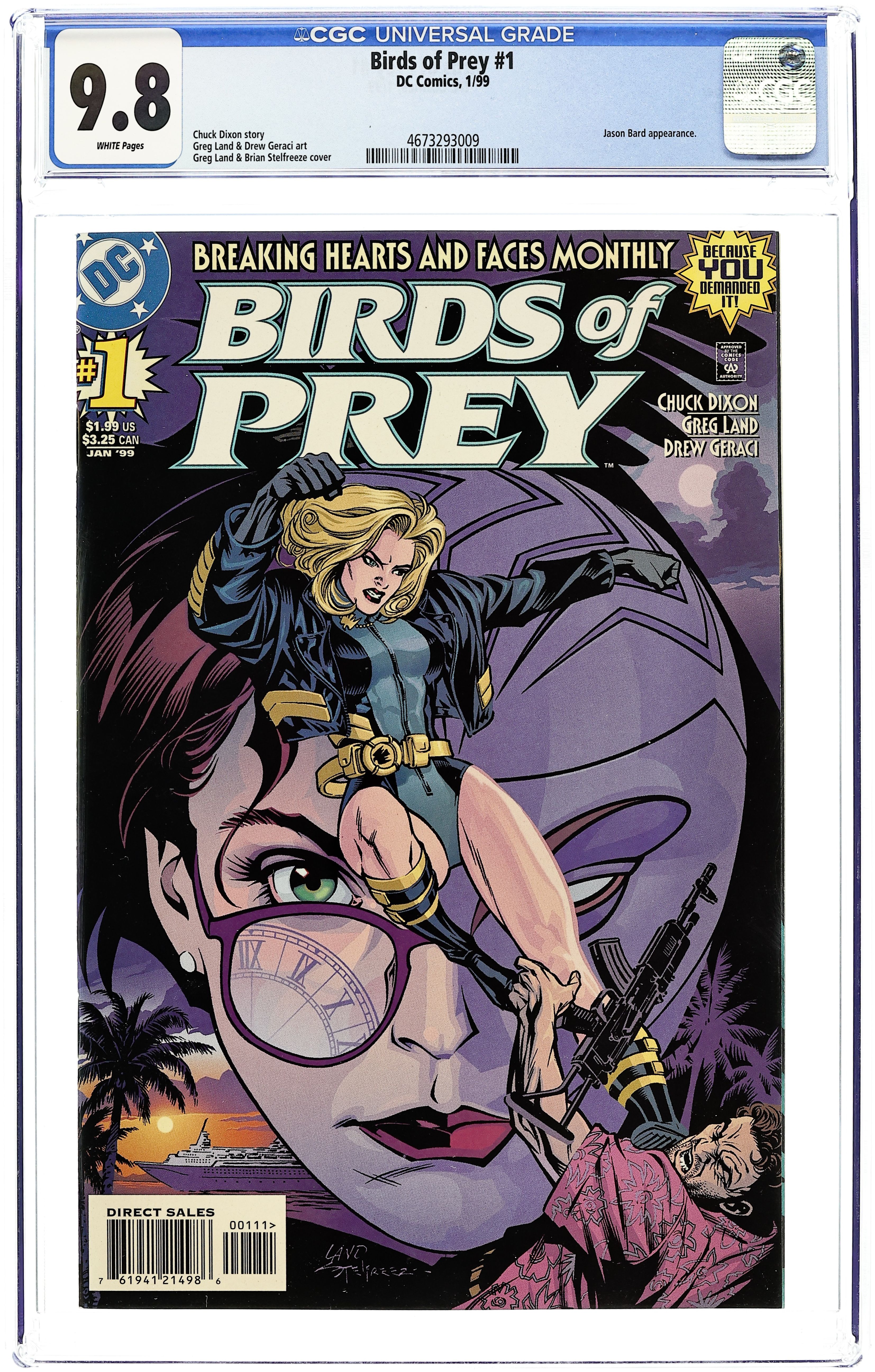 Written by Chuck Dixon, art by Greg Land & Drew Geraci. Cover by Land & Brian Stelfreeze. NOTE: The Birds of Prey 1st appearance was in Showcase '96 #3 and featured a Lois Lane, Black Canary, and Oracle team-up in an 18-page story titled "Birds of a Feather." By the time Birds of Prey #1 appeared, the team members had changed, but the Showcase '96 #3 story is clearly the beginning of the Birds of Prey series, with script by Jordan Gorfinkel, art by Jennifer Graves and inks by Dave Graff. Cover price $1.99.