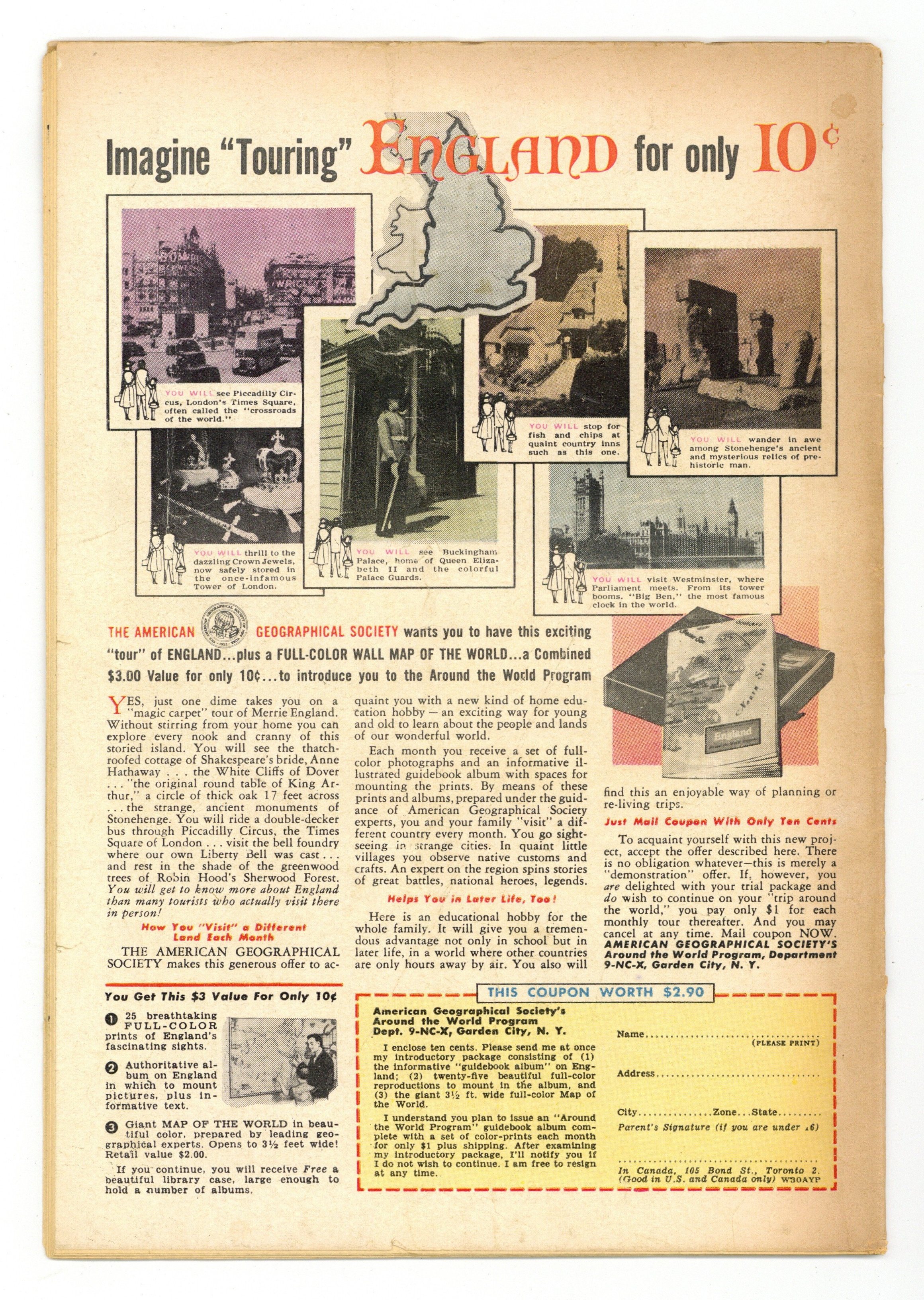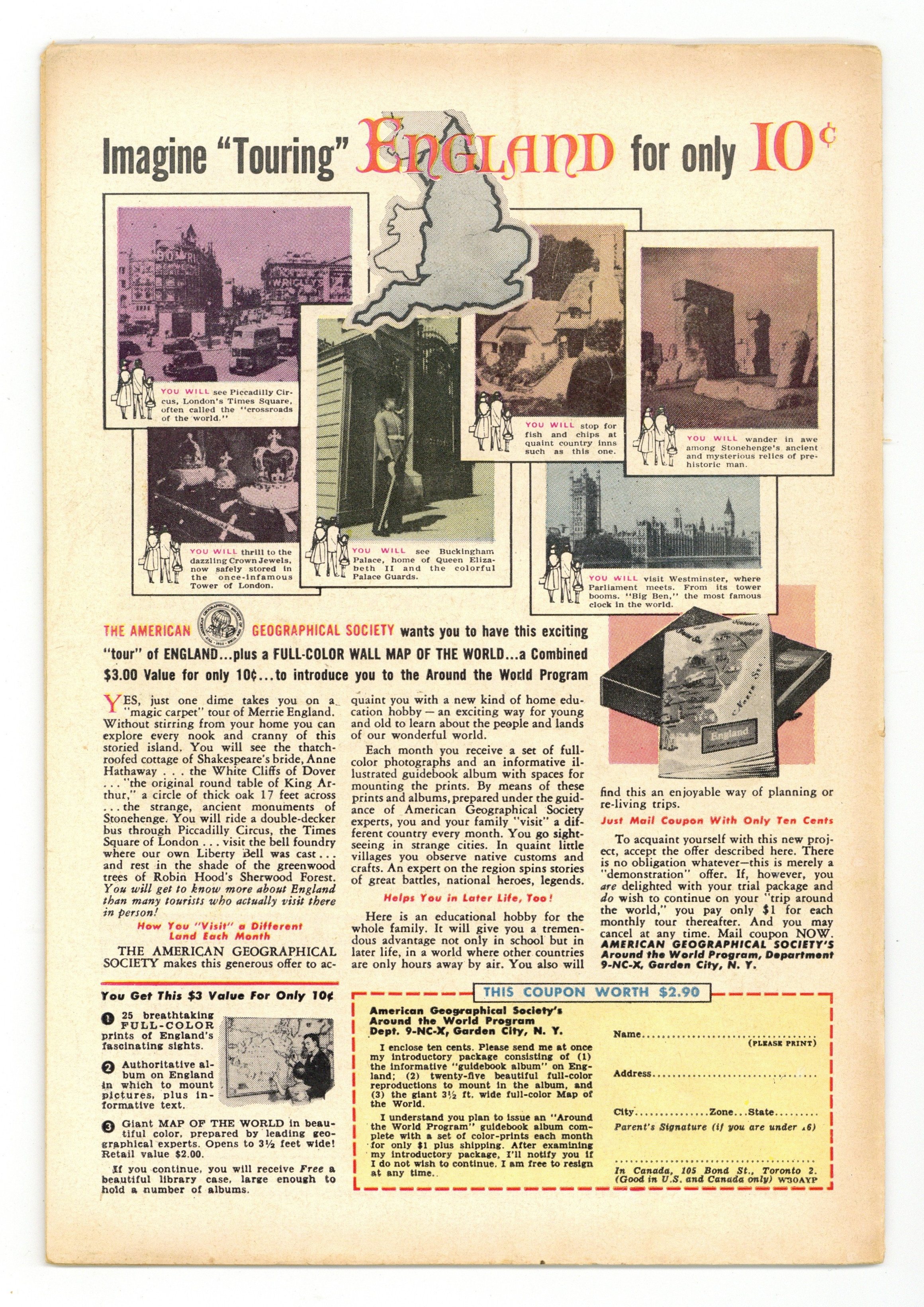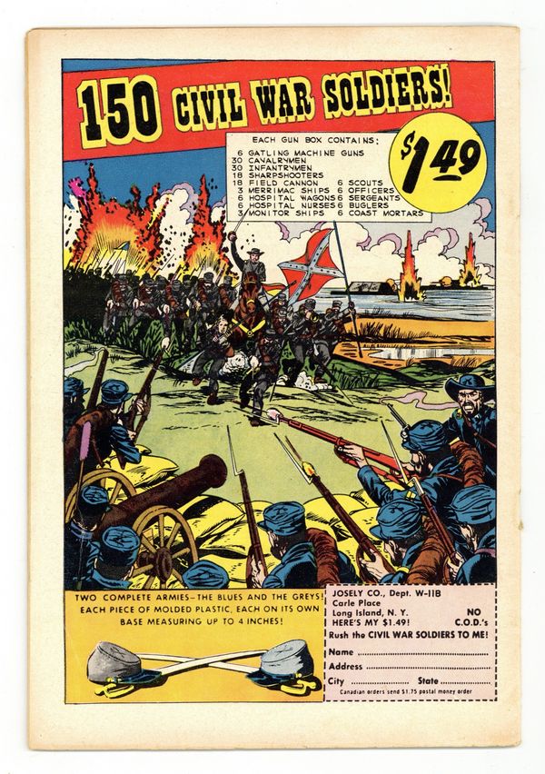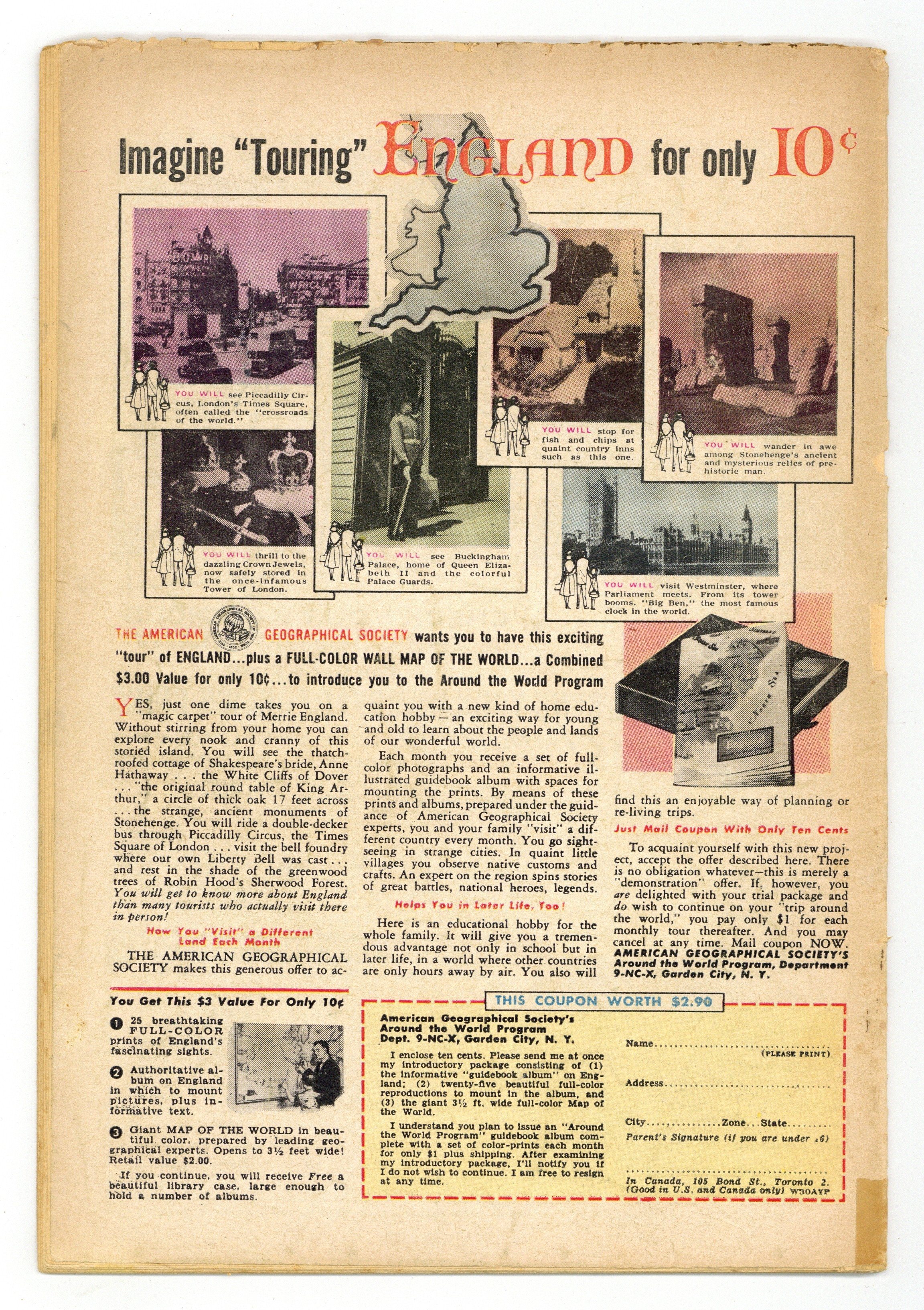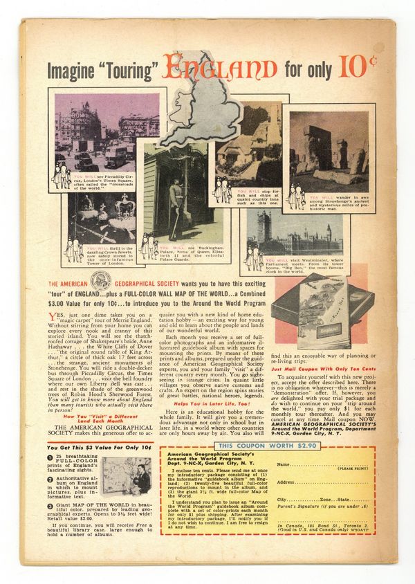 Starts Jan 3 Cover by Al Plastino. "Superman Loses His Powers," script by Jerry Coleman, pencils by Wayne Boring, inks by Stan Kaye; Exposure to ancient Atlantean experiments gives Bart Wellins super-powers and Superman can't stop him because exposure to the same experiments have increased his powers so much, he doesn't dare to use them at all. "The Jungle Journal," script by Jack Miller, art by Nick Cardy. One-page Ollie story by Henry Boltinoff. Adventures in Coin Collecting article. Supermen of America ad. One-page Lem 'n' Lime story by Henry Boltinoff. 36 Pages, Full Color. $.10 Cover price $0.10.
