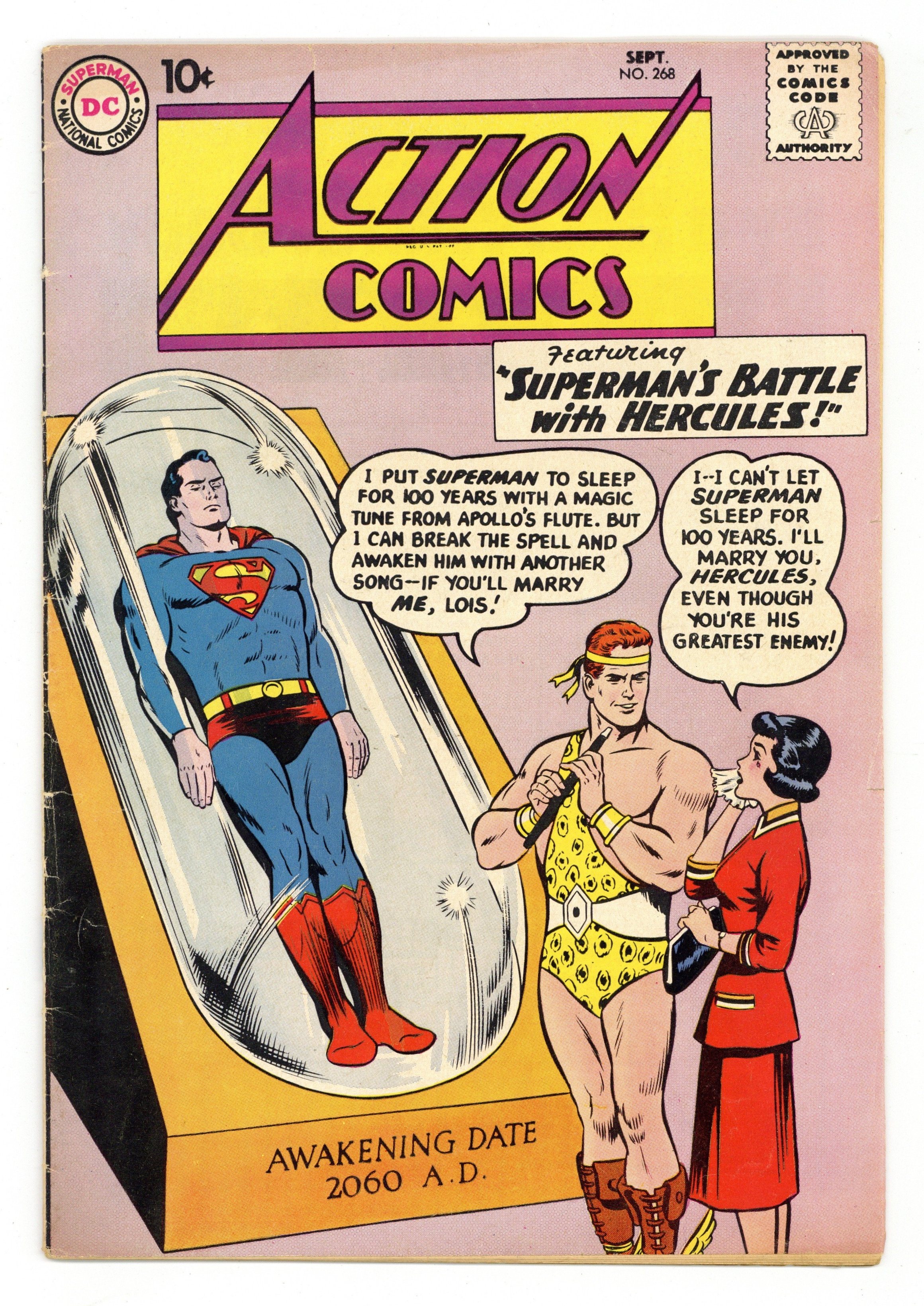 Starts Jan 19 Cover pencils by Curt Swan, inks by Stan Kaye. "Superman's Battle With Hercules!", script by Otto Binder, pencils by Wayne Boring, inks by Stan Kaye; Hercules wants to marry Lois, but Lois won't marry him while Superman is around, so Hercules tries to get rid of Superman. "The Mystery Supergirl!", script by Otto Binder and Jerry Siegel, art by Jim Mooney; While working an internship at the Daily Planet, Linda Lee discovers that someone is impersonating her as Supergirl around the world. 36 Pages, Full Color. $.10 Cover price $0.10.