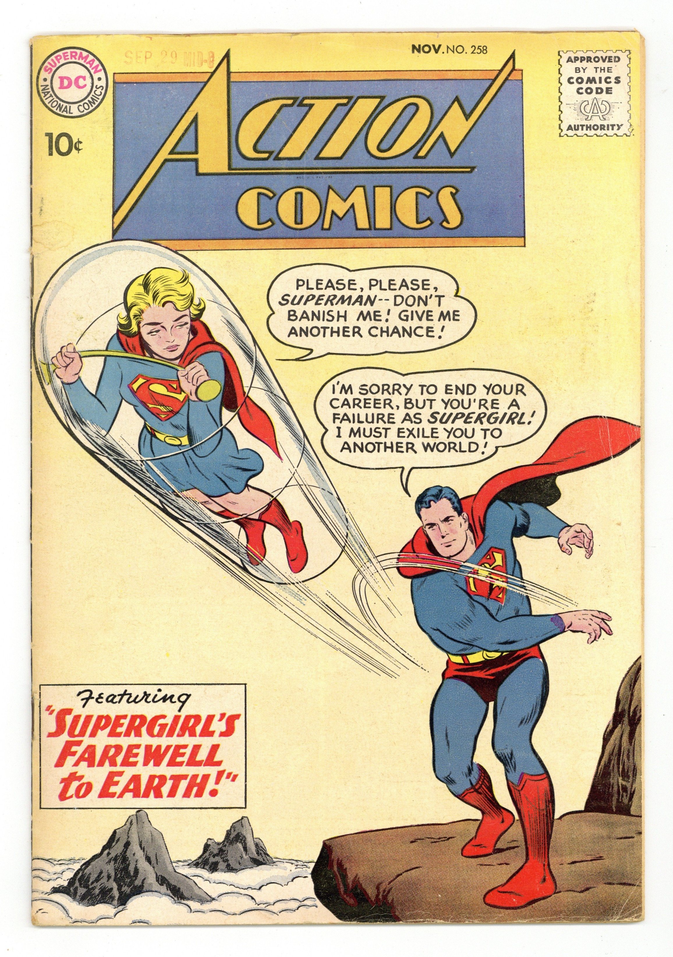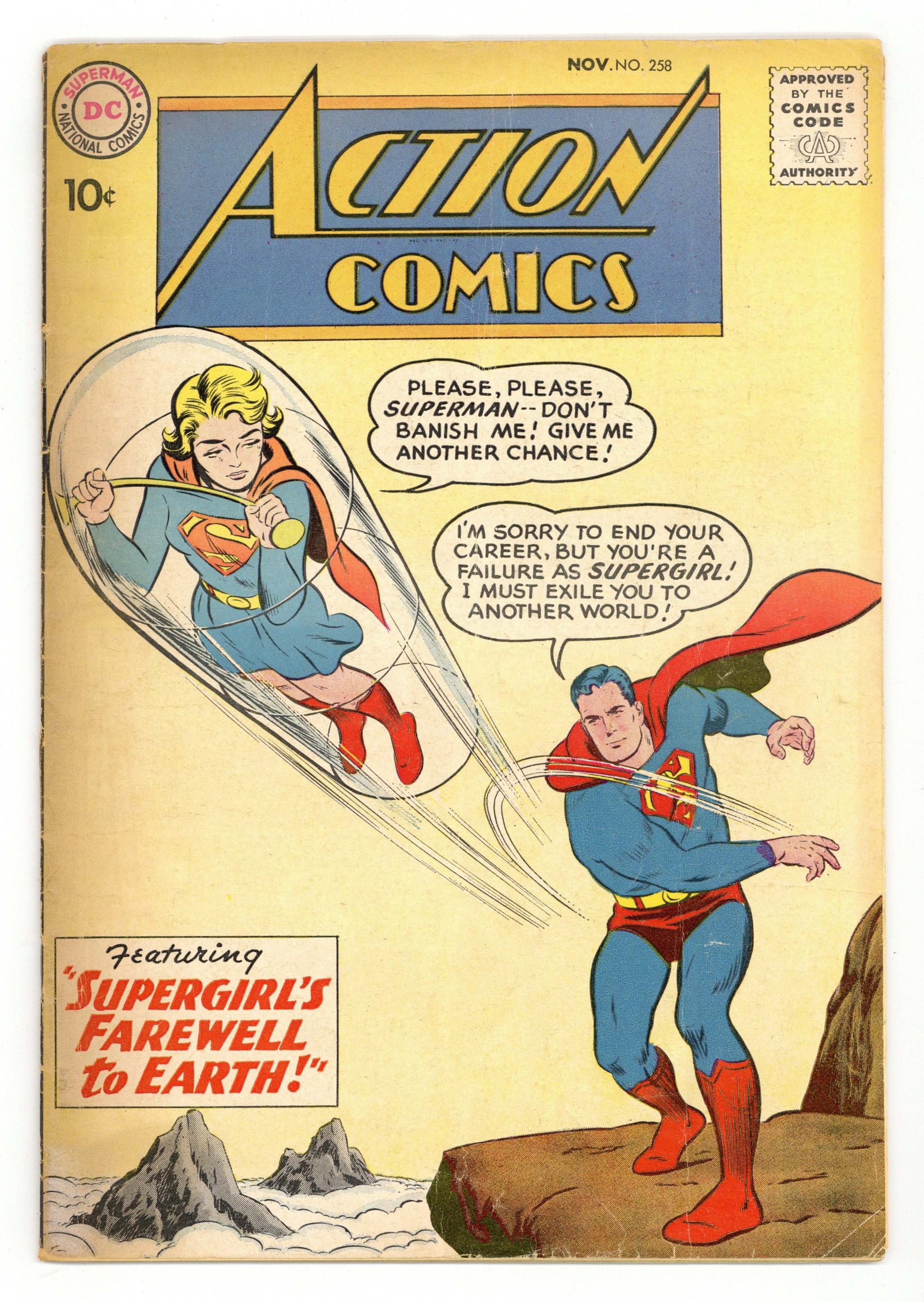 Starts Jan 19 Cover pencils by Curt Swan, inks by Stan Kaye. "The Menace of the Cosmic Man," script by Bill Finger, pencils by Wayne Boring, inks by Stan Kaye; General Malvio creates a robot superhero so that he can use him to assassinate the President of Borkia. One-page Tricksy story by Henry Boltinoff. "Congorilla Goes to War," script by Robert Bernstein, art by Howard Sherman; Congorilla protects a daffy ex-Foreign Legion officer who thinks his pets are still his troops. "Supergirl's Farewell to Earth!", script by Otto Binder, art by Jim Mooney; Superman punishes Supergirl for revealing her existence to Krypto; But Supergirl discovers a secret about Superman all by herself. 36 Pages, Full Color. $.10 Cover price $0.10.