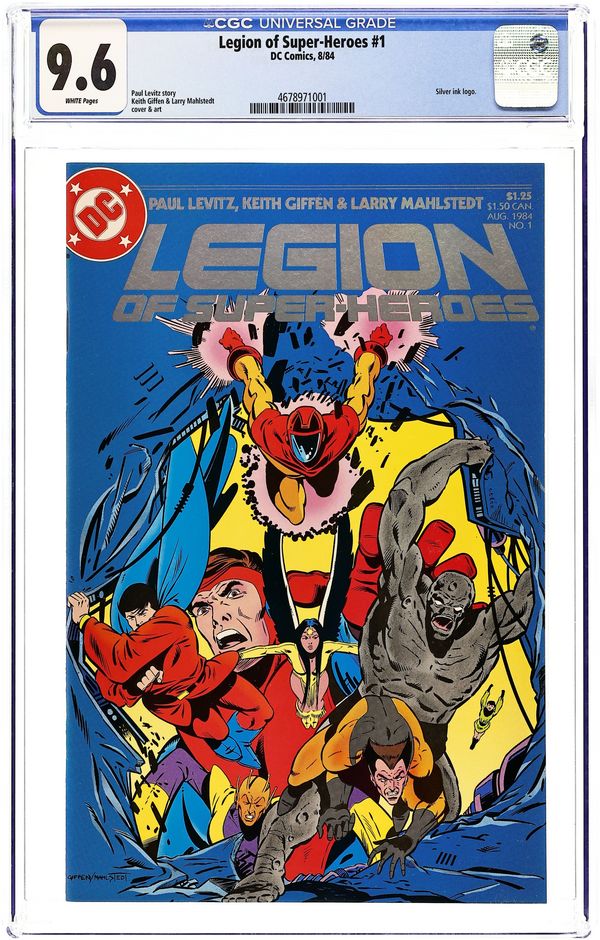 Legends Chapter 4. It's the debut of the first ever mini-series spin-off from another mini-series! Cosmic Boy heads from his berth in the Legion of Super-Heroes (and his guest-staring appearances in the most talked about mini-series of the year, Legends) to a four-issue mini-series of his own that takes the 30th century hero on a perilous voyage through time, space and self! The story begins in the pages of Legends as Cosmic Boy, on an historical sabbatical from the 30th century, becomes embroiled in the world-shattering events of Legends. It continues here, in Cosmic Boy #1, the start of an epic four-part tale, crafted by Paul Levitz, Keith Giffen, Ernie Colon and Bob Smith. A beaten and wounded Cosmic Boy is forced to face his sense of self-worth and power as he fights to recover his health even as he tries to overcome despair. But with the help of Night Girl and remembrance of times past, recovery is possible. With it comes the realization that the 20th century history Cosmic Boy has studied in his own era has been tampered with. Is history being changed? Or has everything Cosmic Boy always believed to be true been a deception perpetrated across ten centuries? Cosmic Boy is the story of one man's journey through his soul, and it is created by some of the people who know him best: Legion scripter Paul Levitz; Legion artist emeritus Keith Giffen; penciller Ernie Colon (the last two gentlemen were also one half of the team responsible for the Legionnaires 3 mini-series); and inker Bob Smith. And let's not forget a cover by one-time legion penciller Steve Lightle. Cover price $0.75.