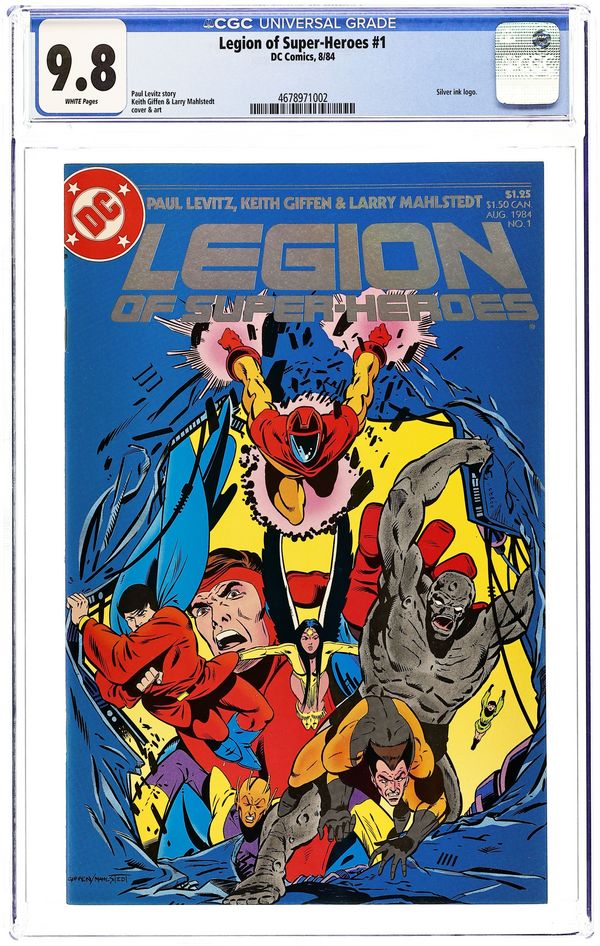 Cover pencils by Keith Giffen, inks by Larry Mahlstedt. Darkseid, script by Keith Giffen (plot) and Paul Levitz (plot, script), pencils by Keith Giffe, inks by Larry Mahlstedt; The Legionnaires call on all their reserve members as well as other allies to battle the Daxamites under Darkseid's control; Highfather returns and restores Orion's clone to its rightful form, sending it against Darkseid, but it is the combined power of the Legion that defeats Darkseid in the end; The Great Darkness Saga, Part 5; Dedicated to Jack Kirby. 52 pgs. $1.00. Cover price $1.00.