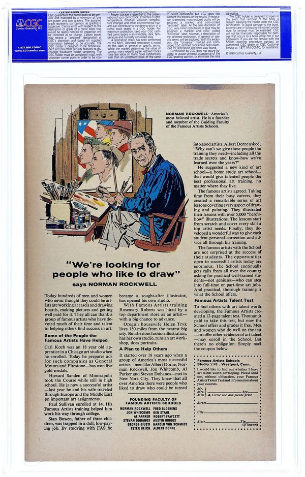 Ends Feb 16 9:41 PM CST Bid History 5 bids Current Bid $11 Your Secret Max Bid If you'd like to bid, please log in or register. Cover by Jack Kirby and George Roussos. Showdown With the Human Top!, script by Stan Lee, art by Jack Kirby and Dick Ayers; Human Top steals civil defense plans and wants to sell them to the Communists. The Sorcerer text story, art by Joe Maneely; A man who has travelled the world and seen wonders performed by hermits in India returns home to find that his young nephew creates magic with only belief. No Place to Turn!, script by Stan Lee and Larry Lieber, art by Larry Lieber and Matt Fox; Aliens transform a spy into a human, but because they can only receive black-and-white images from Earth they leave him green and he is discovered. Somewhere Waits a Wobbow!, script by Stan Lee and Larry Lieber, art by Larry Lieber and George Roussos [as G. Bell]; The Wasp tells the tale of future mercenary pilot Rack Morgan who disobeys the rules once too many. 36 pgs., full color. $0.12. Cover price $0.12.