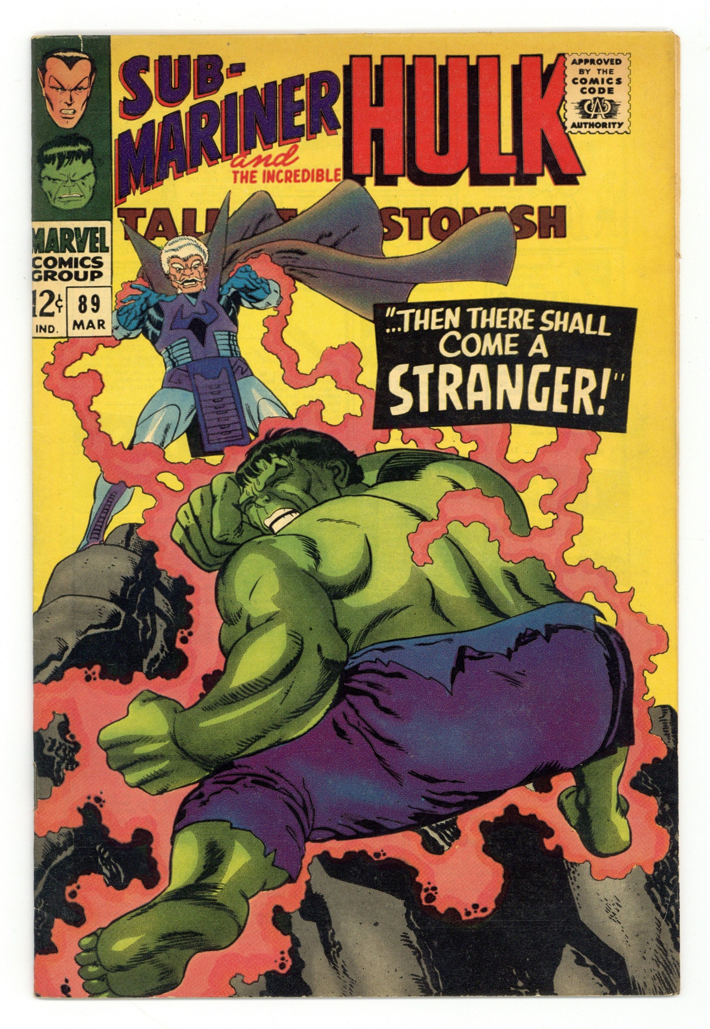 Starts Feb 16 Cover by Gil Kane. Outside the Gates Waits..Death!, script by Stan Lee, art by Bill Everett and Dan Adkins; As the new ruler of Atlantis, Byrrah has Namor arrested and sent to the dreaded Inferno Isle; Namor battles the lava monster that lives there and returns to Atlantis to seek his vengeance; Meanwhile, back in the undersea kingdom, Dorma has found Byrrah's hypnosis machine that won him the throne and uses it to turn the Atlantean allegiance back to Namor. Whosoever Harms the Hulk..!, script by Stan Lee, art by Gil Kane; Ross and his men try to revive the Hulk after his beating by the Abomnation; Returning from the brink of death, Hulk is about to leave when the pleading Rick Jones causes him to transform back to Banner; Banner uses his knowledge to lure Abomination back to Gamma base with Betty in tow; Hulk and Abomination clash once again; Watching from a distant galaxy, the Stranger realizes that the Abomination is a much better ally than the Hulk and zaps him to his side, ending the battle. 36 pgs., full color. $0.12. Cover price $0.12.