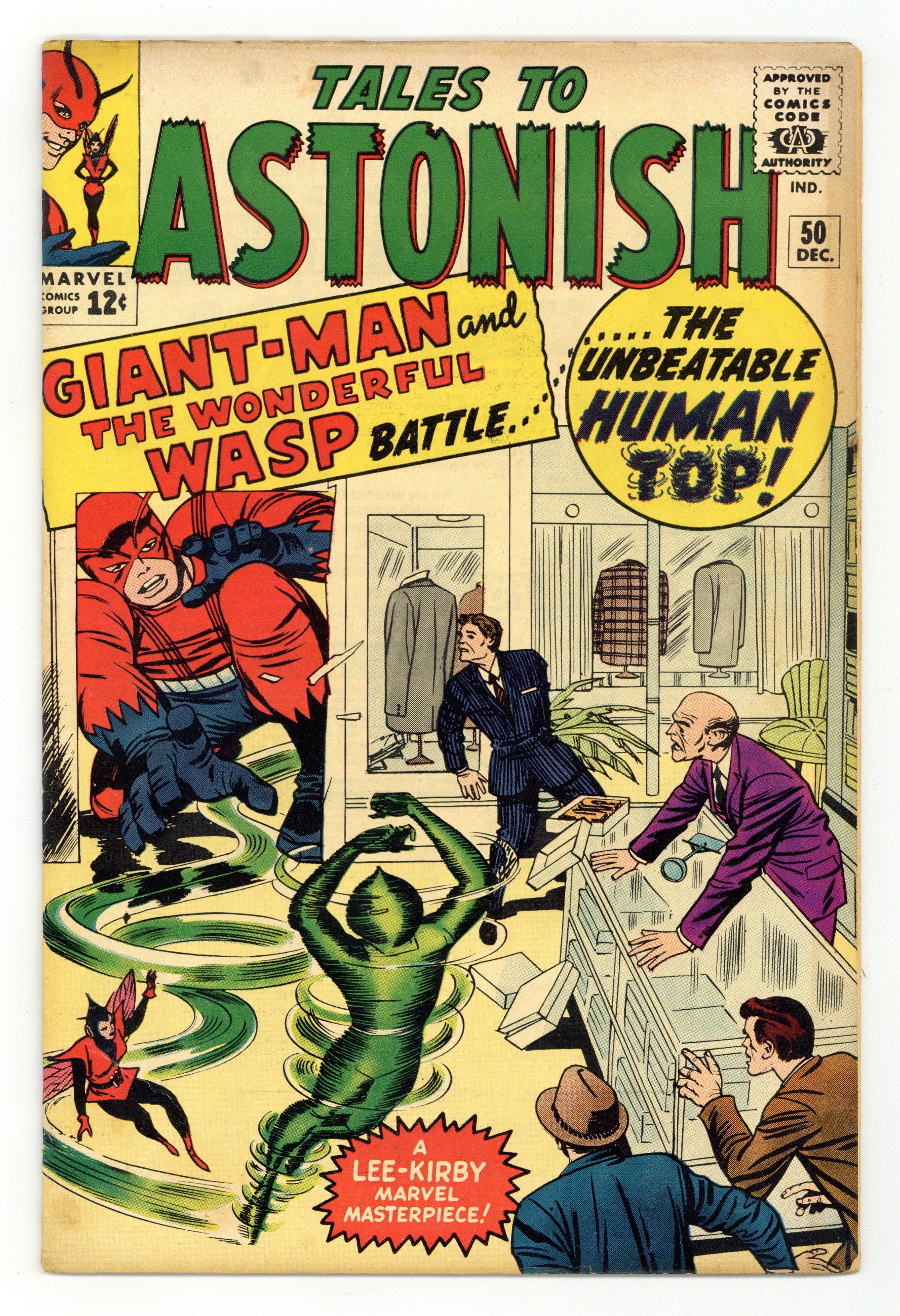 Starts Feb 16 Cover by Jack Kirby and Sol Brodsky. The Human Top!, script by Stan Lee, art by Jack Kirbym, Steve Ditko, and Don Heck; Henry Pym follows the crime spree of the Human Top in the newspapers but the Wasp convinces Henry to go after him as Giant-Man. Mystery Trip text story, art by Joe Maneely; Tommy's uncle returns from a space journey needing to re-learn how to walk on earth instead of floating. The Secret of Sagattus!, script by Stan Lee and Larry Lieber, art by Larry Lieber and Matt Fox; A wise king listens only to the advice of a hunchback, causing the jealous nobles to murder the hunchback. No Ending!, script by Stan Lee and Larry Lieber, art by Larry Lieber; A dictator is tormented by dreams of running on a treadmill suspended high in the sky. 36 pgs., full color. $0.12. Cover price $0.12.